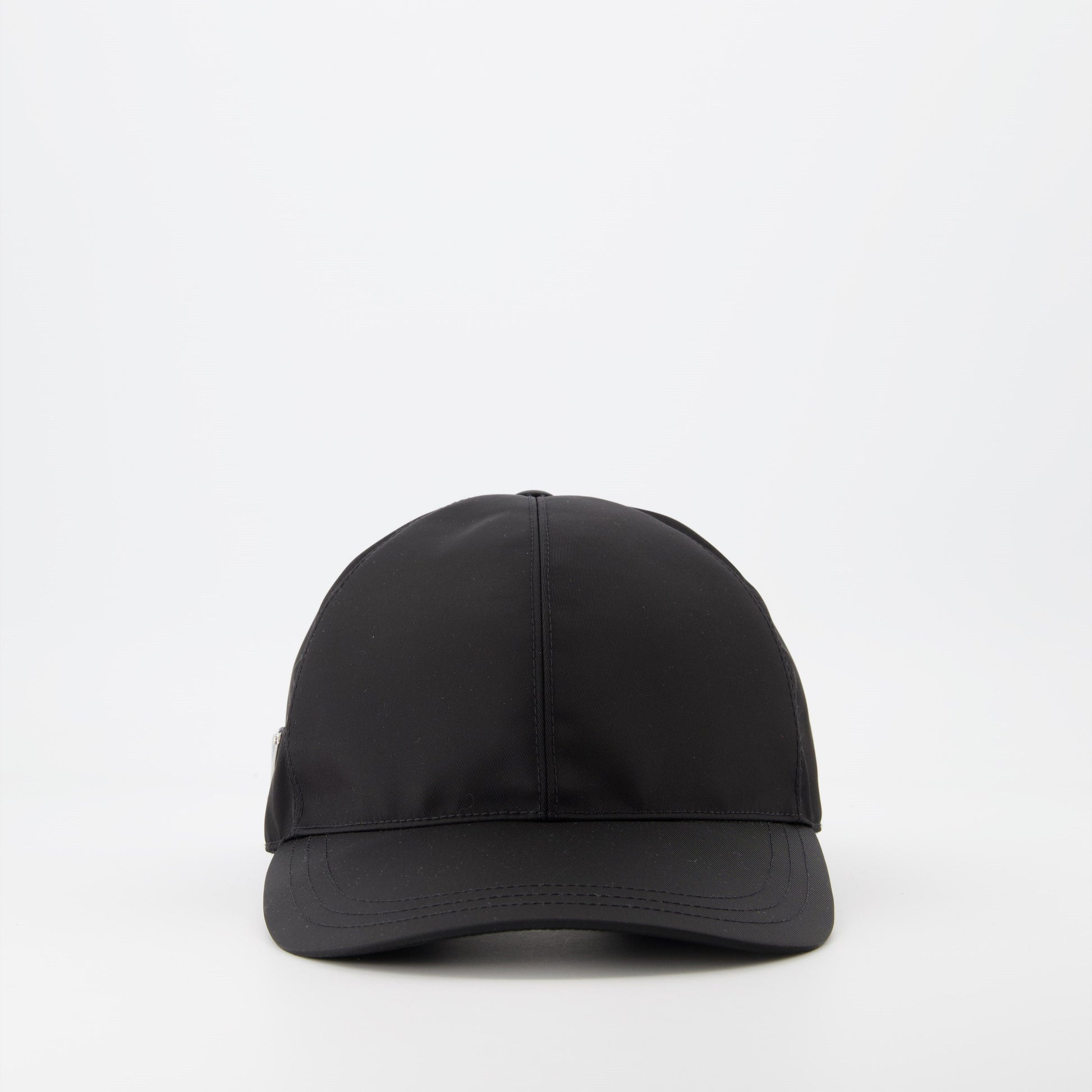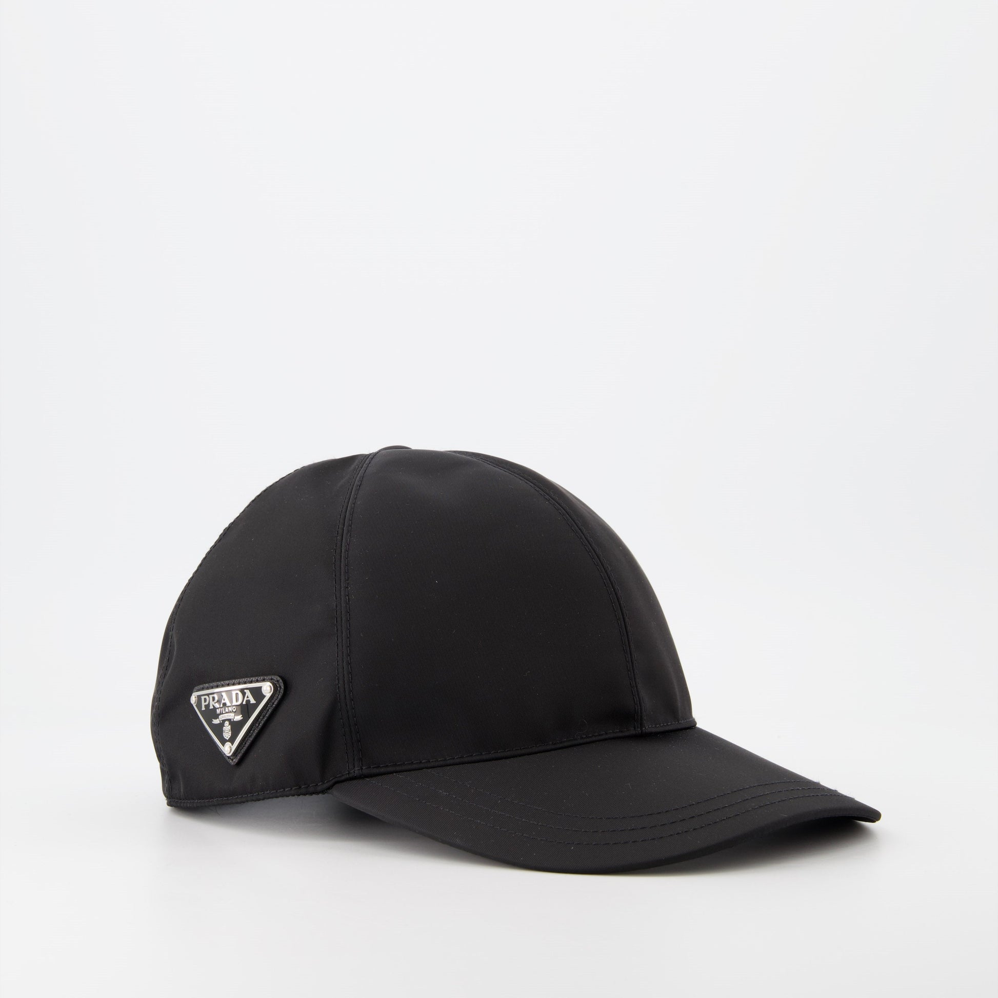 Black Re-Nylon cap from Prada for men from the Spring-Summer 2025 collection. Made from recycled nylon, it features an enameled metal triangle logo and a wide visor.