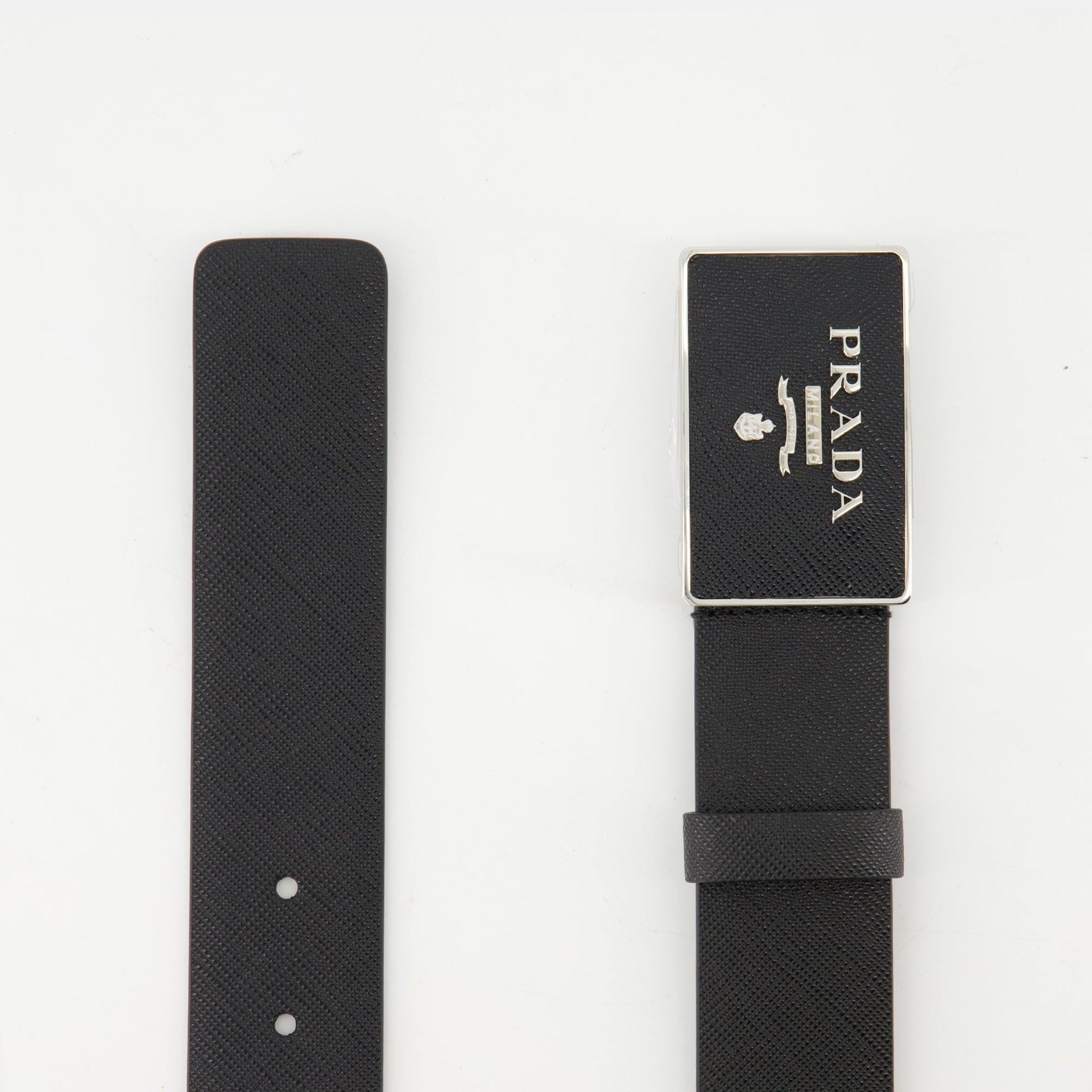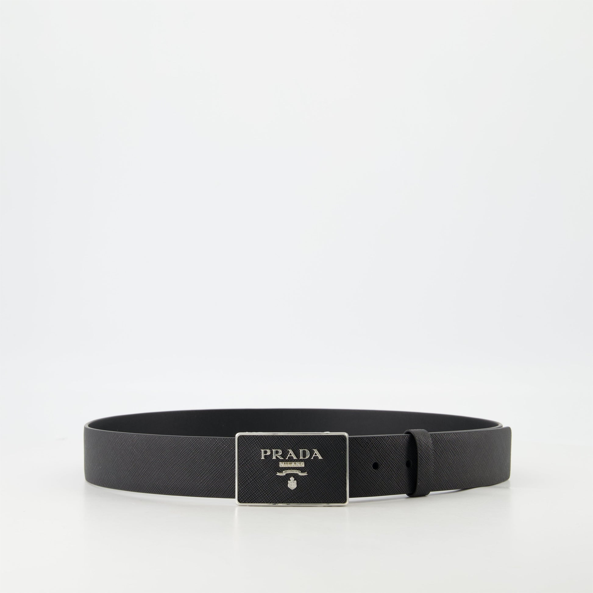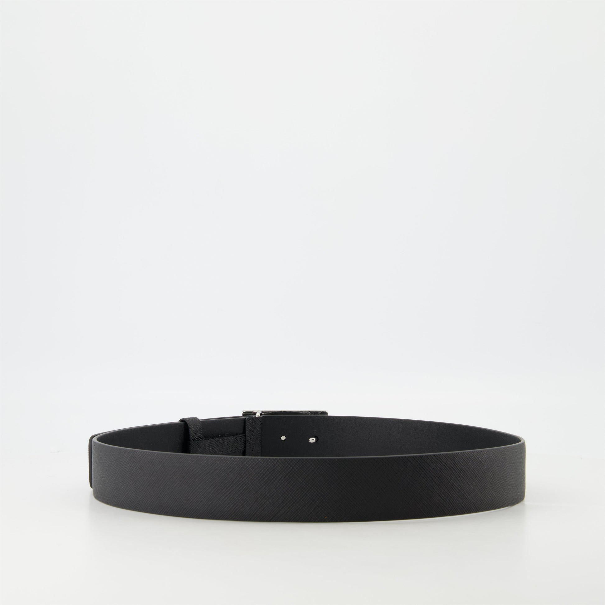 Saffiano black leather belt by Prada for men. This piece is part of the Spring-Summer 2025 collection and is distinguished by its calfskin and metallic logo.