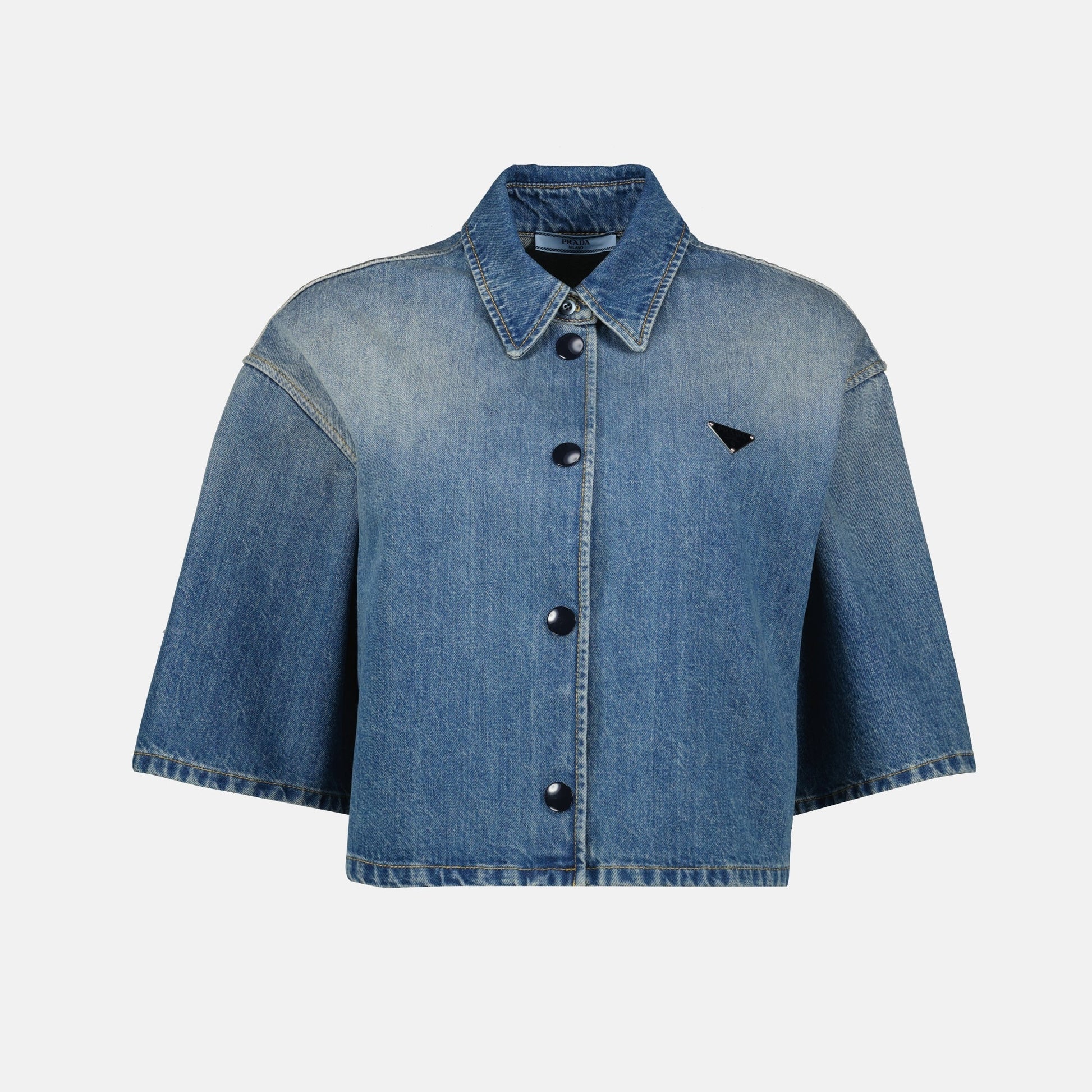 Blue short denim shirt from Prada for women. This piece is part of the Fall-Winter 2025 collection, featuring an oversized cut and elegant details.