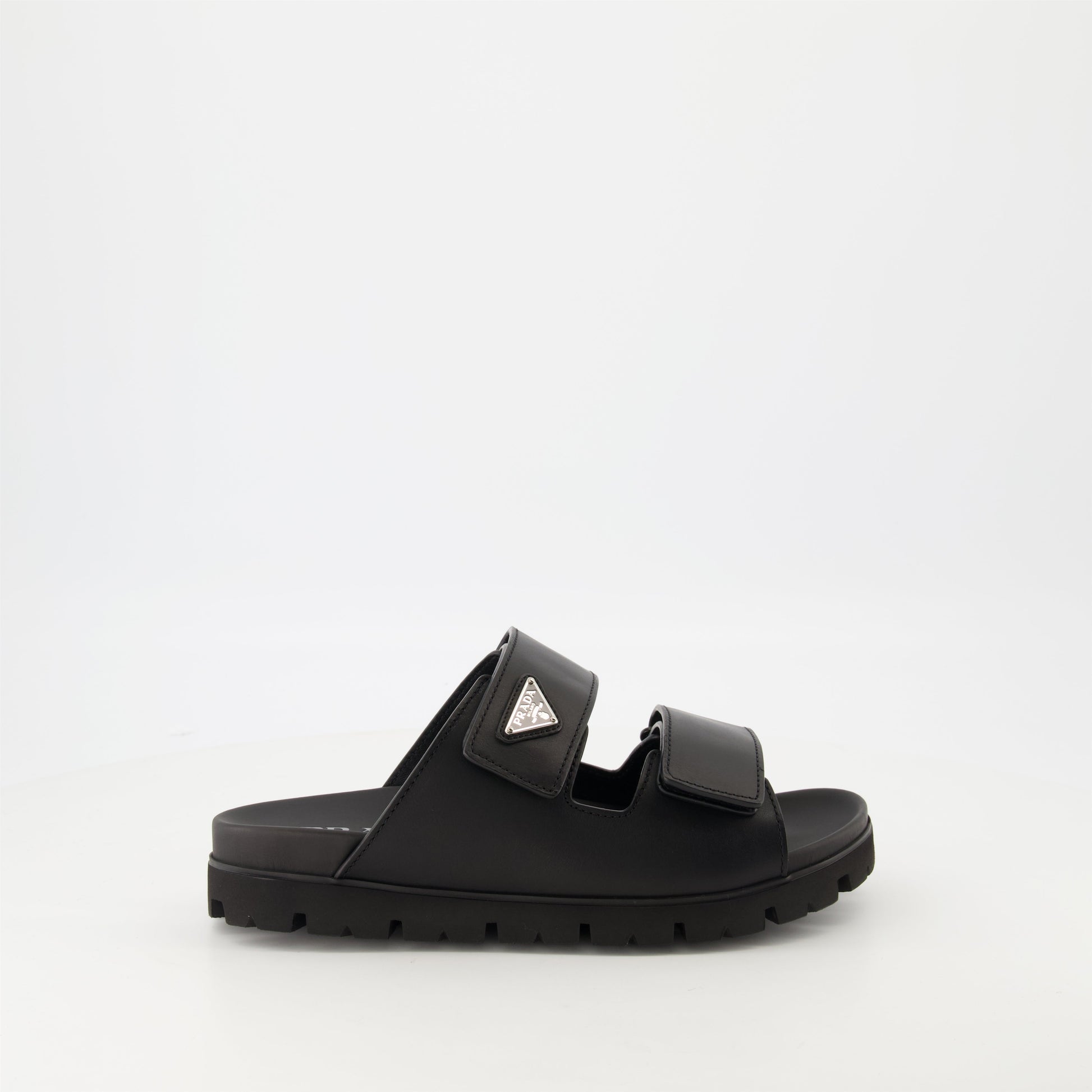 Black leather flip-flops by Prada for men from the Spring-Summer 2025 collection. They are made from calf leather with hook-and-loop fasteners and a rubber cleated sole.