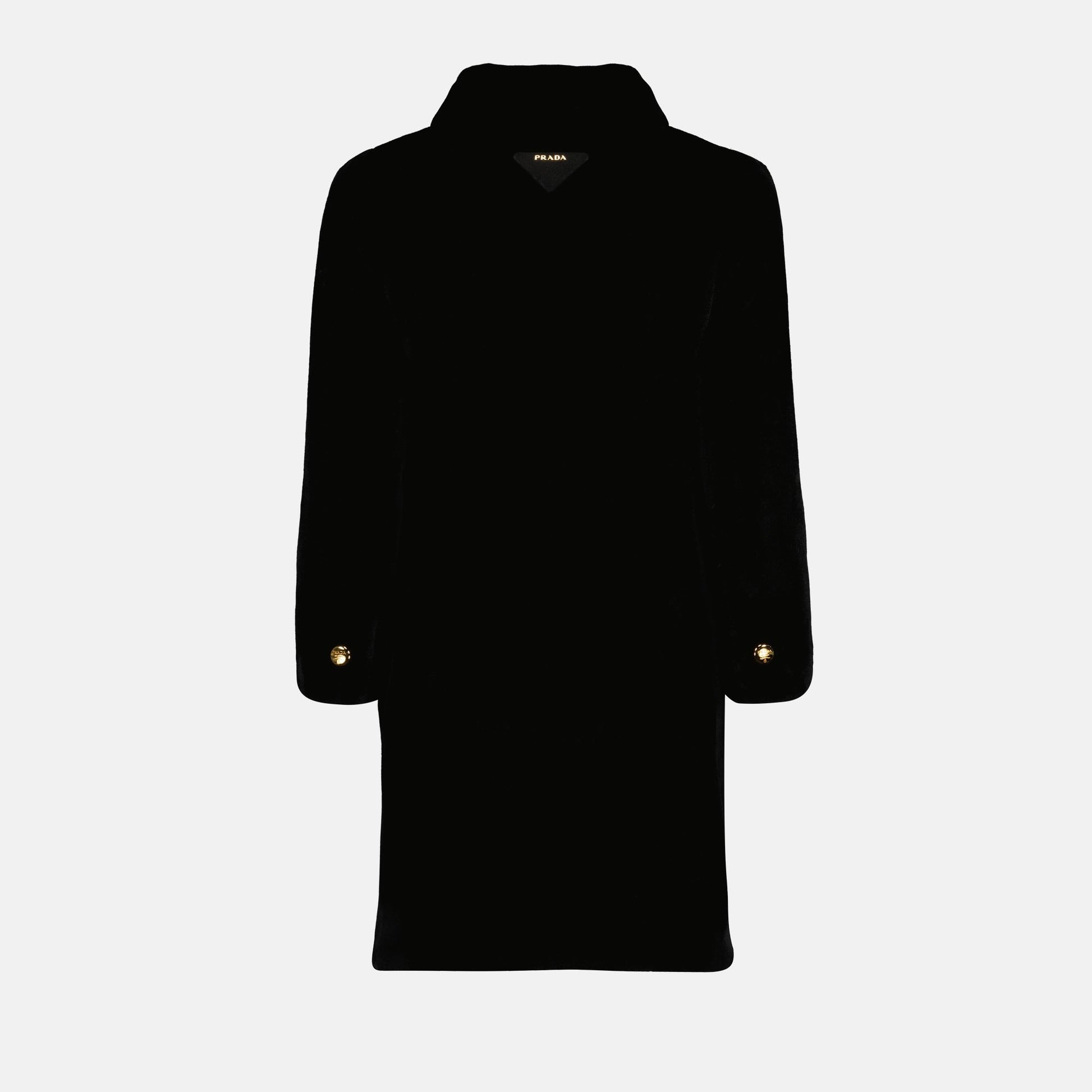 Black faux fur coat by Prada for women, from the Spring-Summer 2025 collection. It features a classic collar, long sleeves, and an elegant design with refined details.