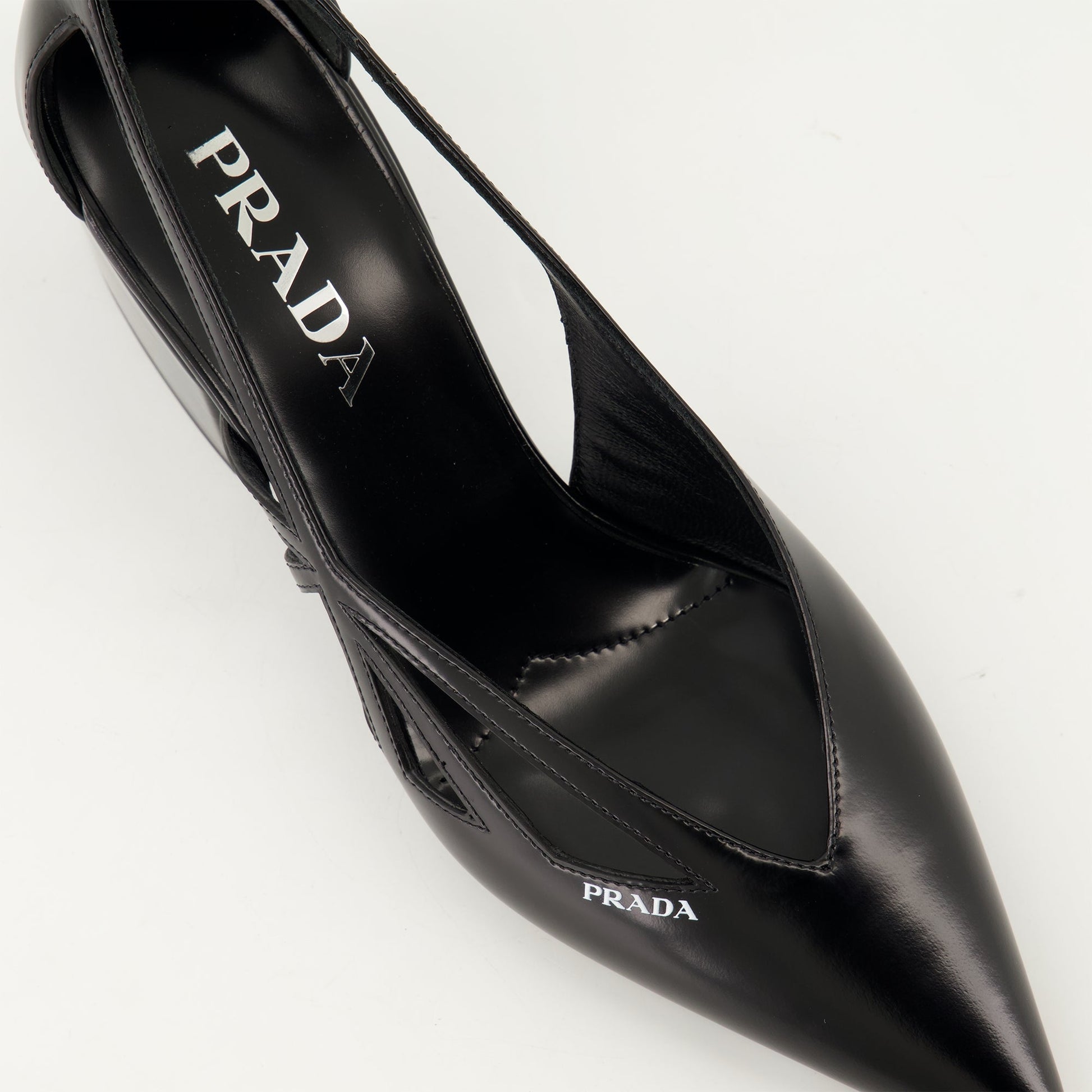 Black glossy leather pumps from Prada for women, Autumn-Winter 2024 collection. Slip-on model with a pointed toe, leather sole, and cut-out effect, made from brushed calfskin.