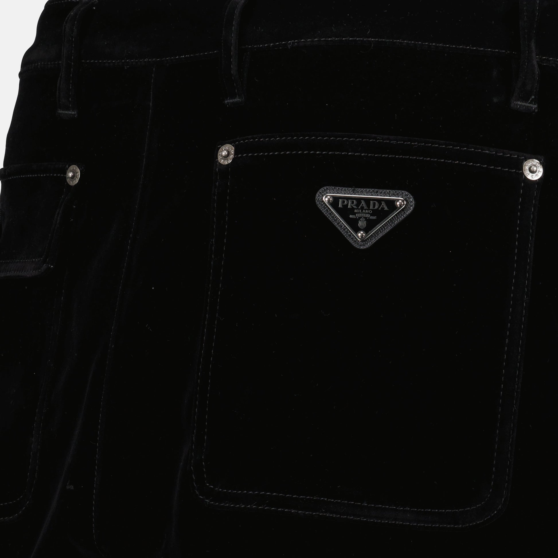 Black velvet denim jeans from Prada for men, from the Spring-Summer 2025 collection. They feature a loose fit and elegant details such as the enamelled metal triangle logo.