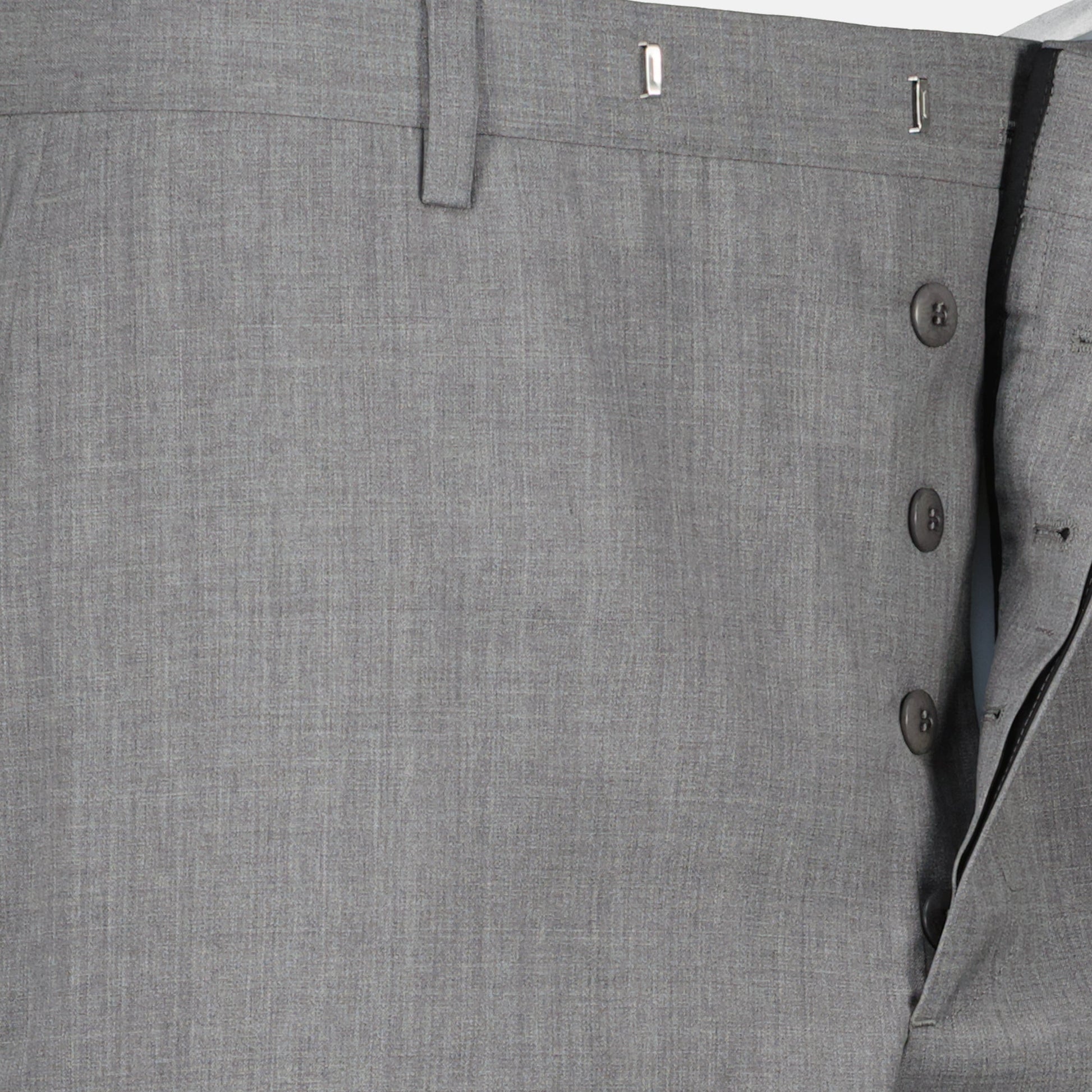 Men's wool jogging pants by Prada from the Autumn-Winter 2025 collection. It features a carrot silhouette with elegant details such as pockets and a woven logo.