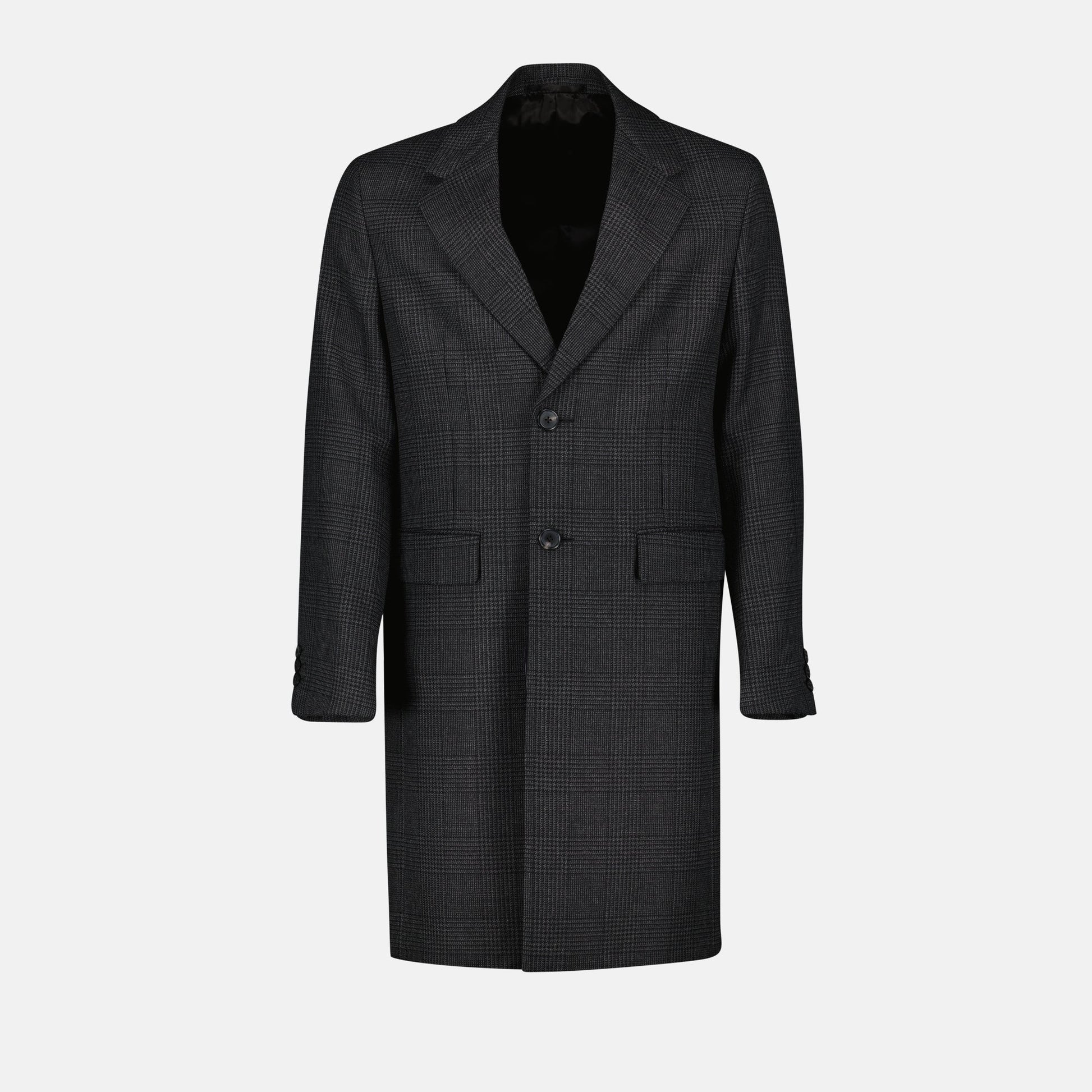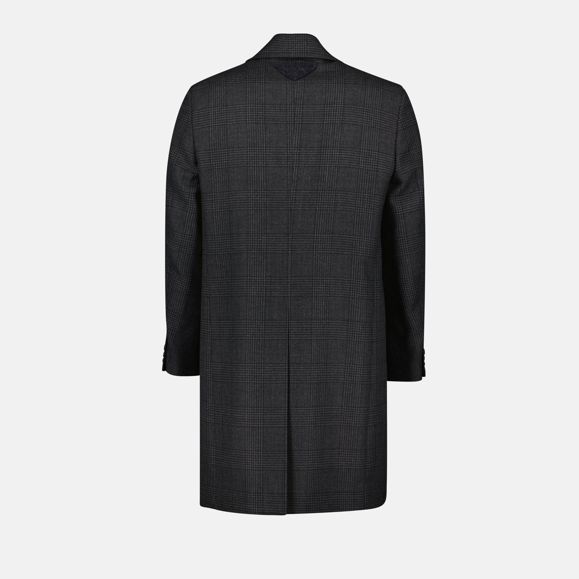 Wool plaid coat from Prada for men, from the Fall-Winter 2024 collection. It features a notch collar, a straight cut, and flap pockets.