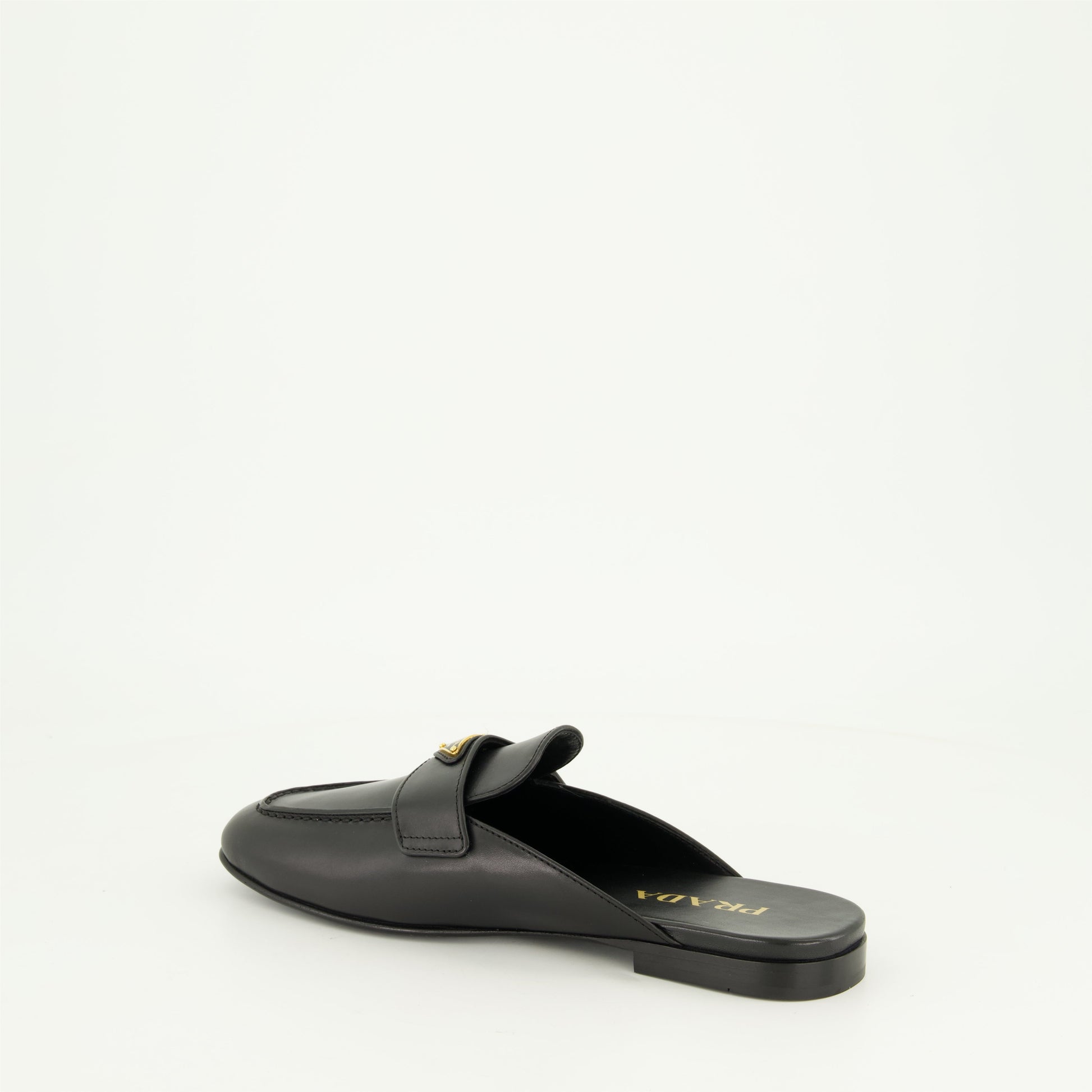 Black leather mules from Prada for women, Spring-Summer 2025 collection. They feature a slip-on design with an almond toe and an enameled metal triangle logo.