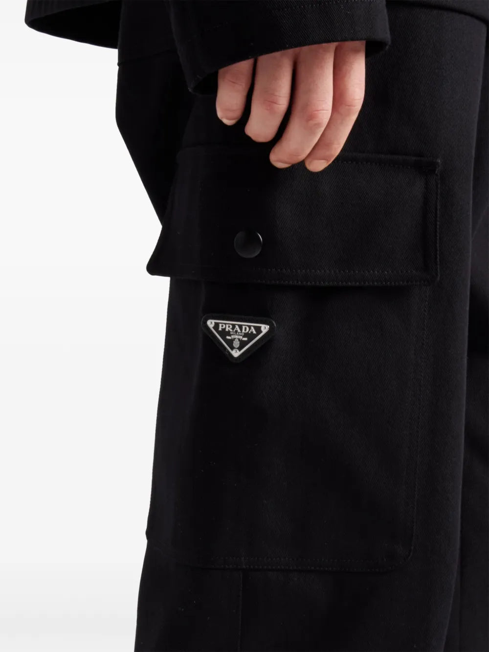 Black cargo pants from Prada for men, made of cotton. This model is part of the Spring-Summer 2025 collection and features a cargo fit with multiple practical pockets.