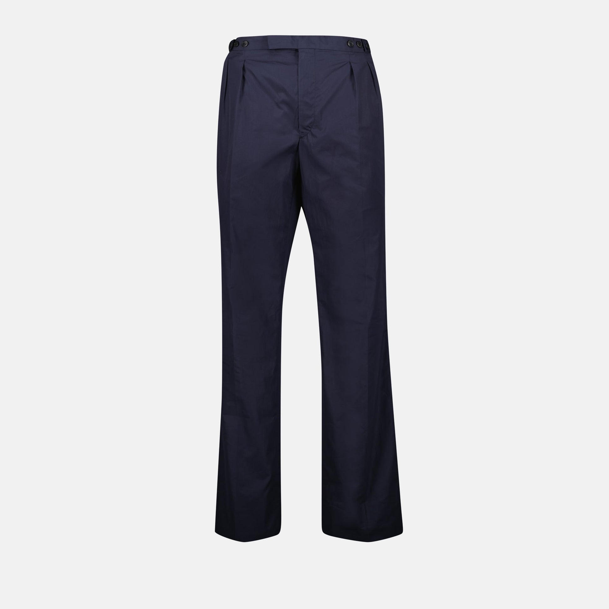 navy blue cotton pants from the brand Prada, designed for men. This model is part of the Spring-Summer 2025 collection and features an elegant straight cut with several pockets.