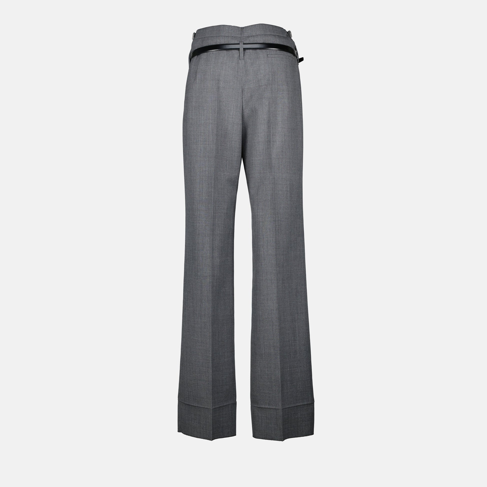 Gray wool dress pants from the brand Prada for women. This model is part of the Spring-Summer 2025 collection featuring a flare cut and elegant details.