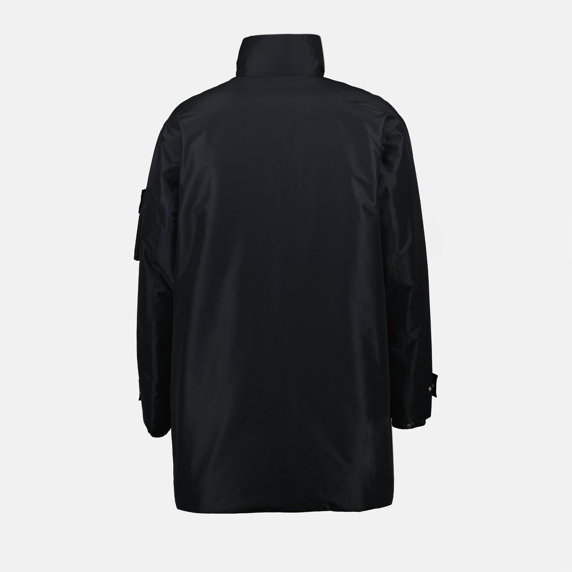 Black Re-Nylon parka by Prada for men, from the Autumn-Winter 2024 collection. This garment combines modern style and functionality with practical details and sustainable design.