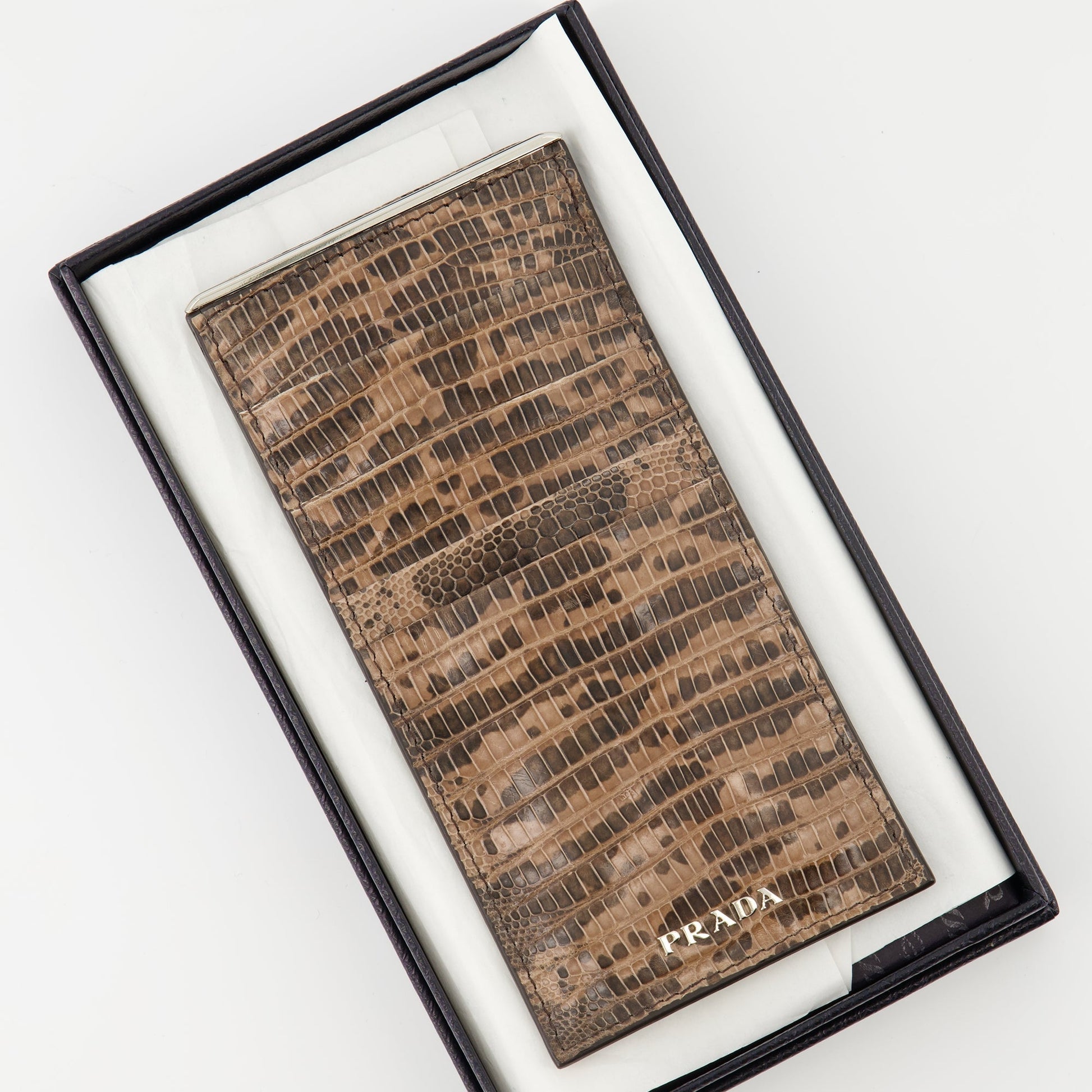 Vintage python-effect card holder by Prada for men. This brown leather item features card slots and bill compartments, combining style and functionality.