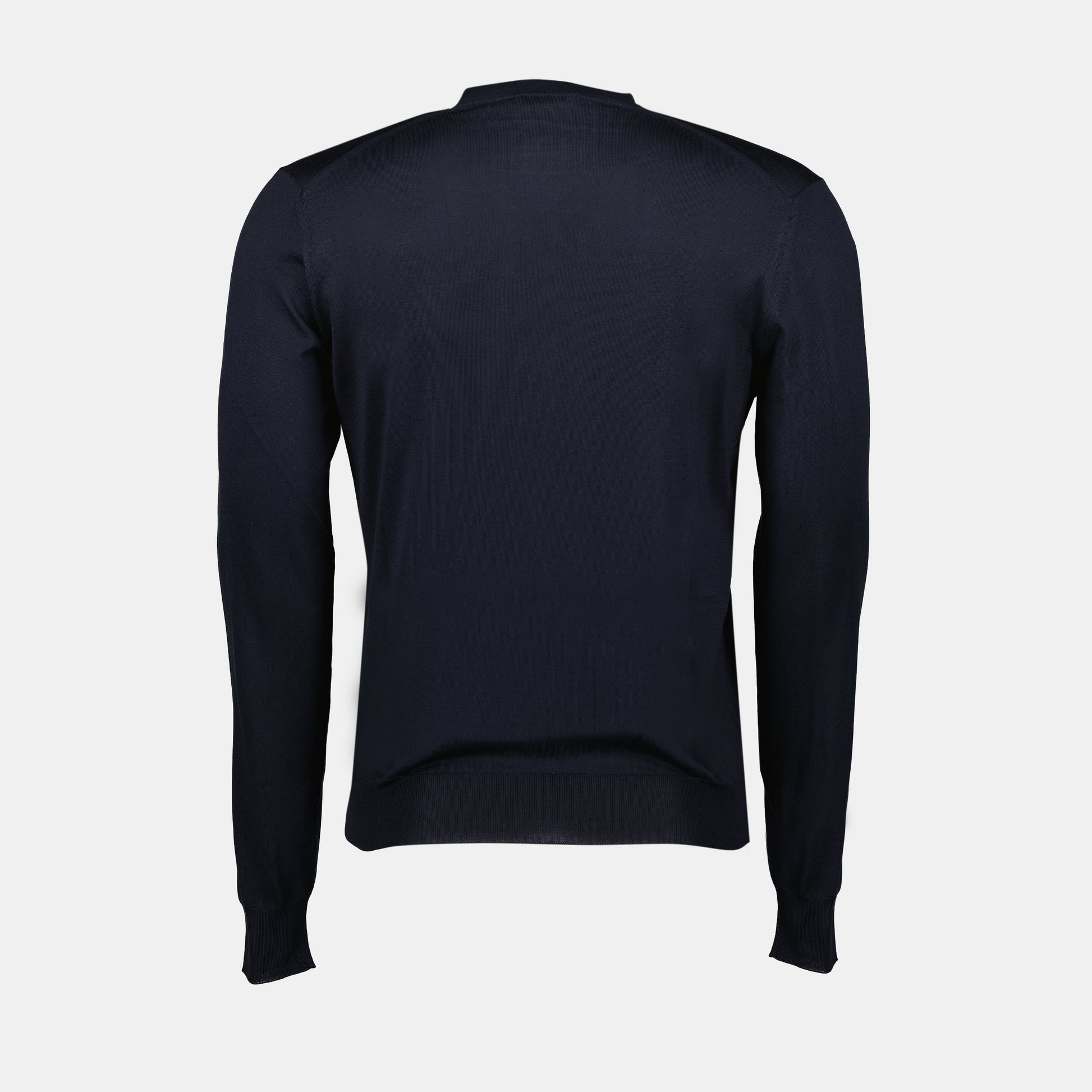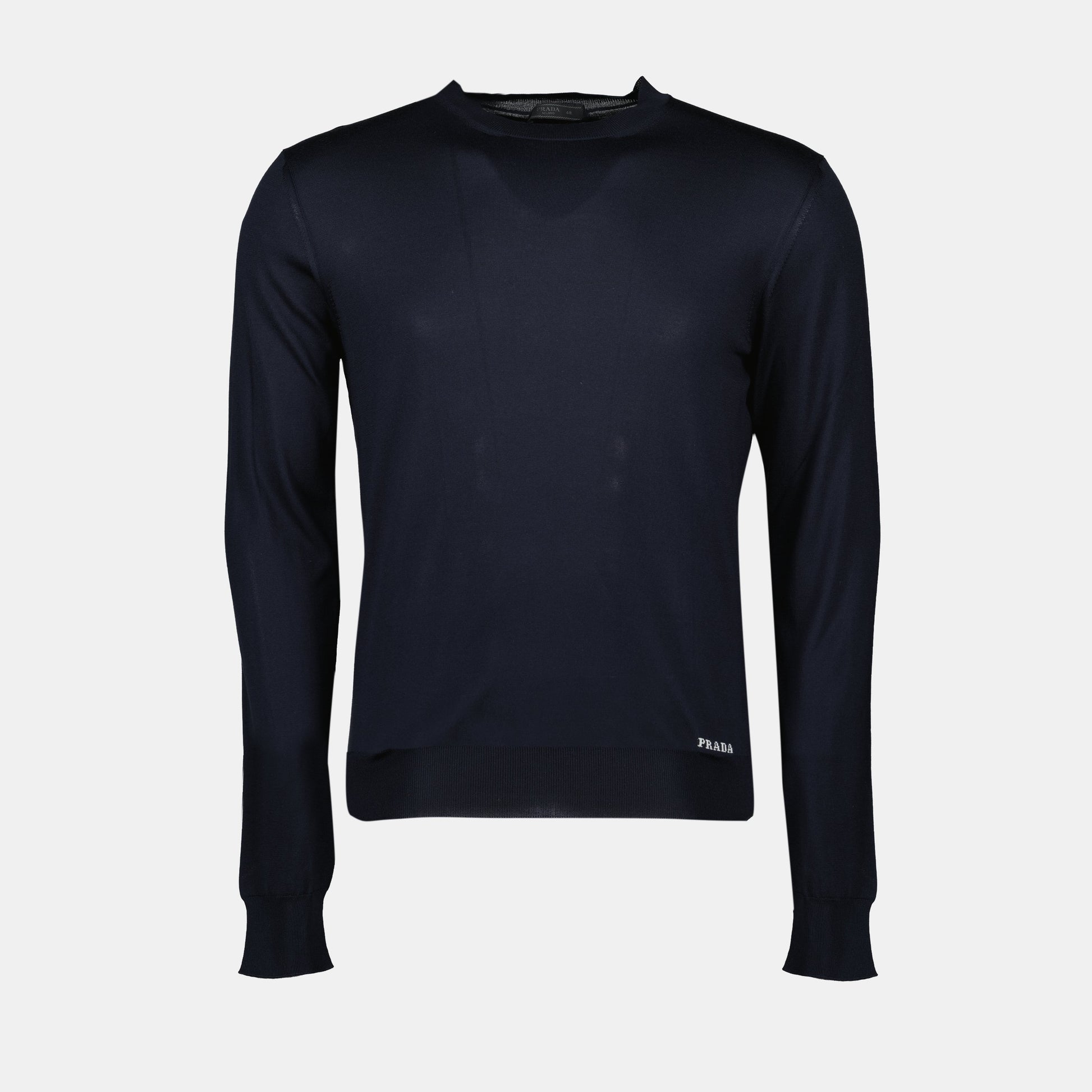 Blue silk sweater by Prada for men. This model is part of the Spring-Summer 2025 collection and is distinguished by its round neck and long sleeves.
