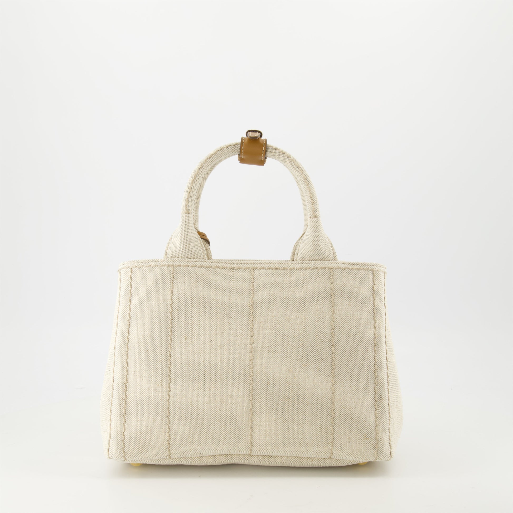 Beige canvas tote bag by Prada for women, from the Spring-Summer 2025 collection. It is made of linen and leather, featuring practical details and an embroidered logo.