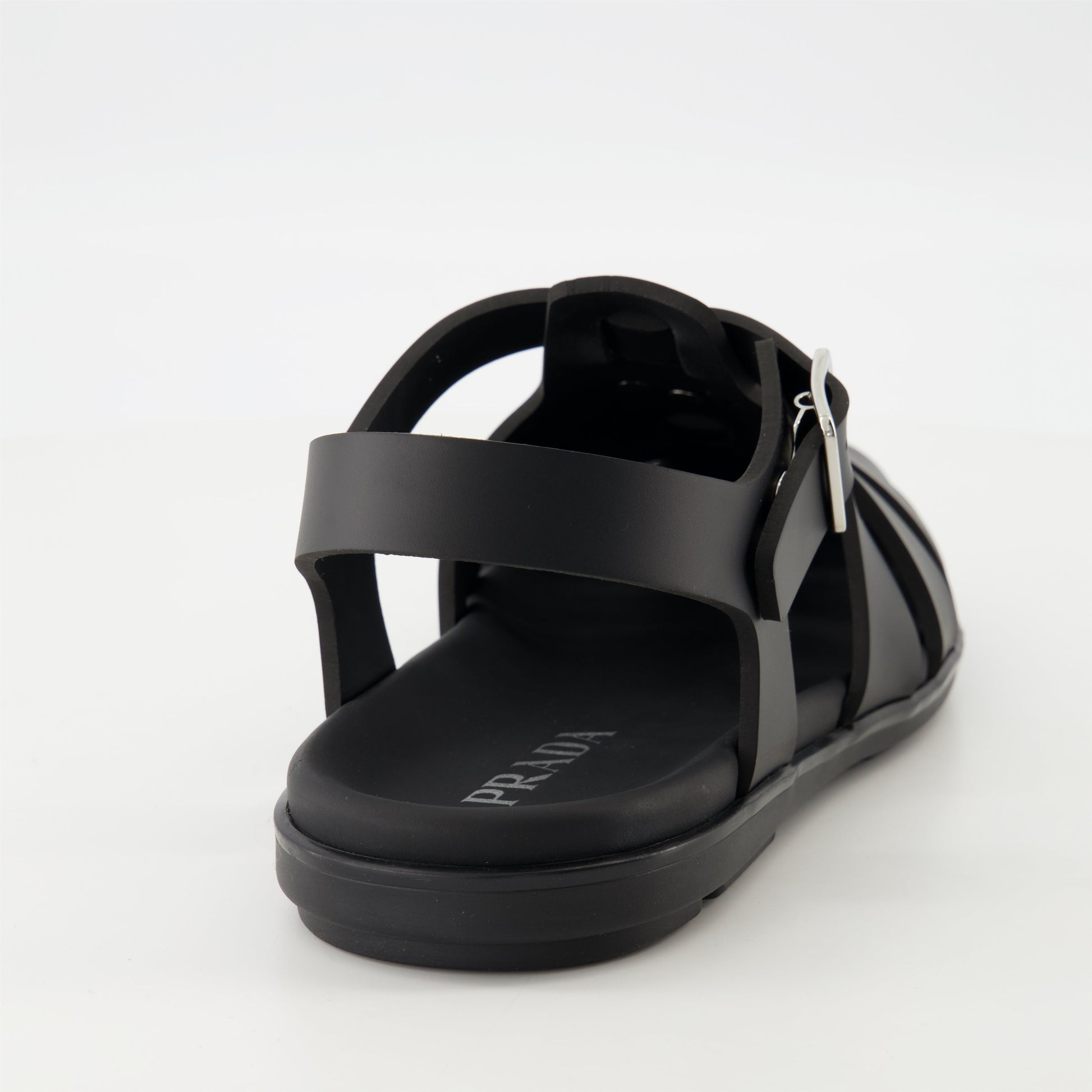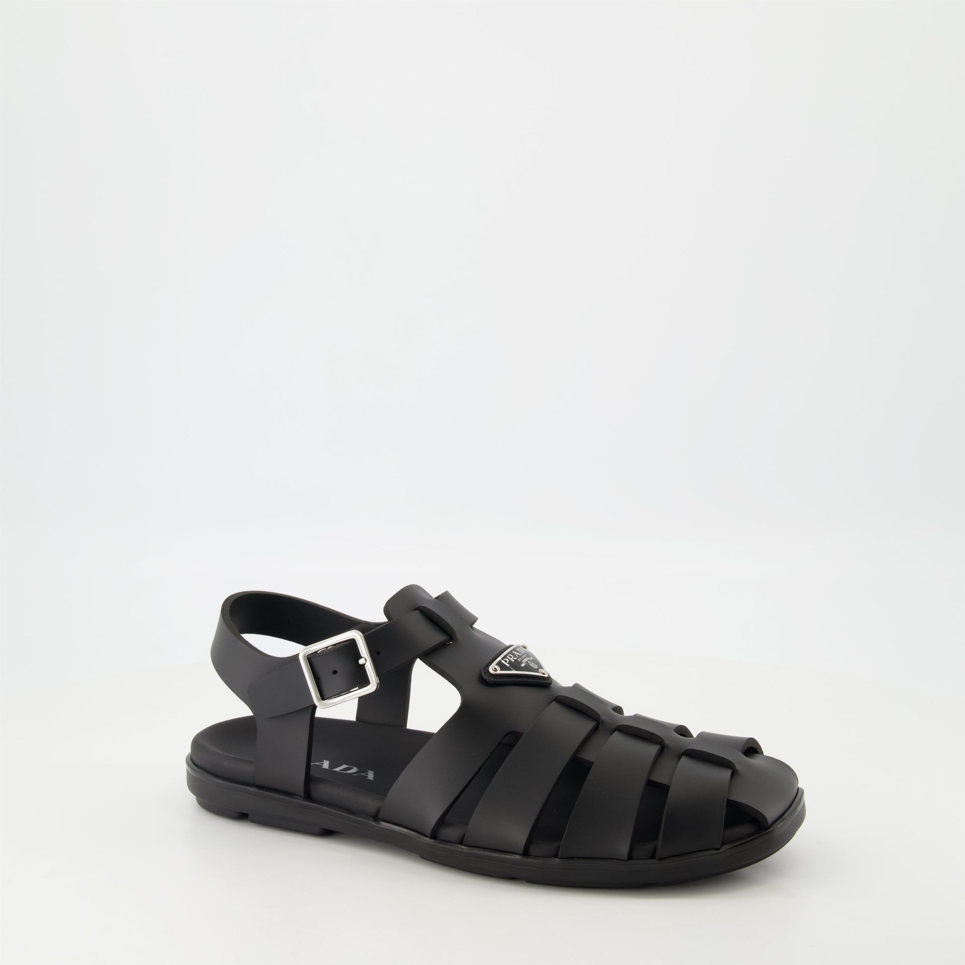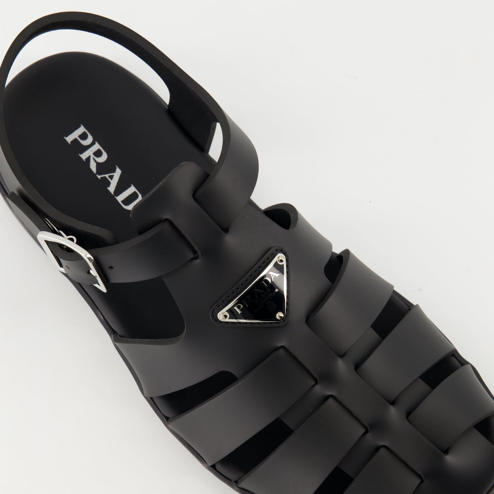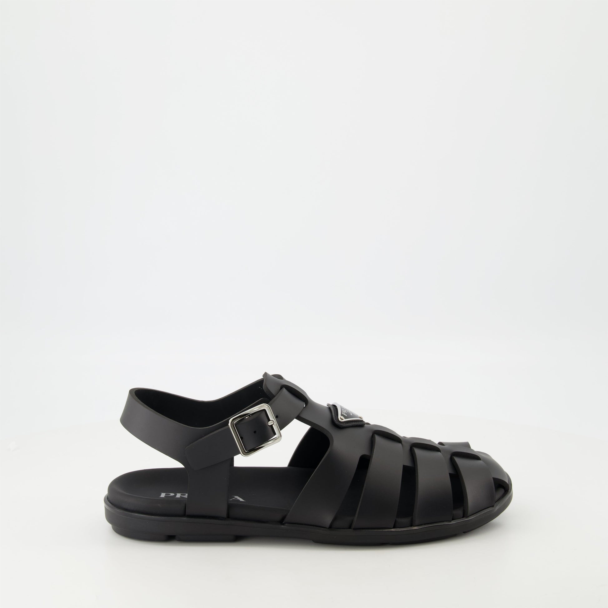 Black rubber fisherman sandals from Prada for men, Spring-Summer 2025 collection. Made of vinyl with a leather insole and an enamelled metal triangle logo.