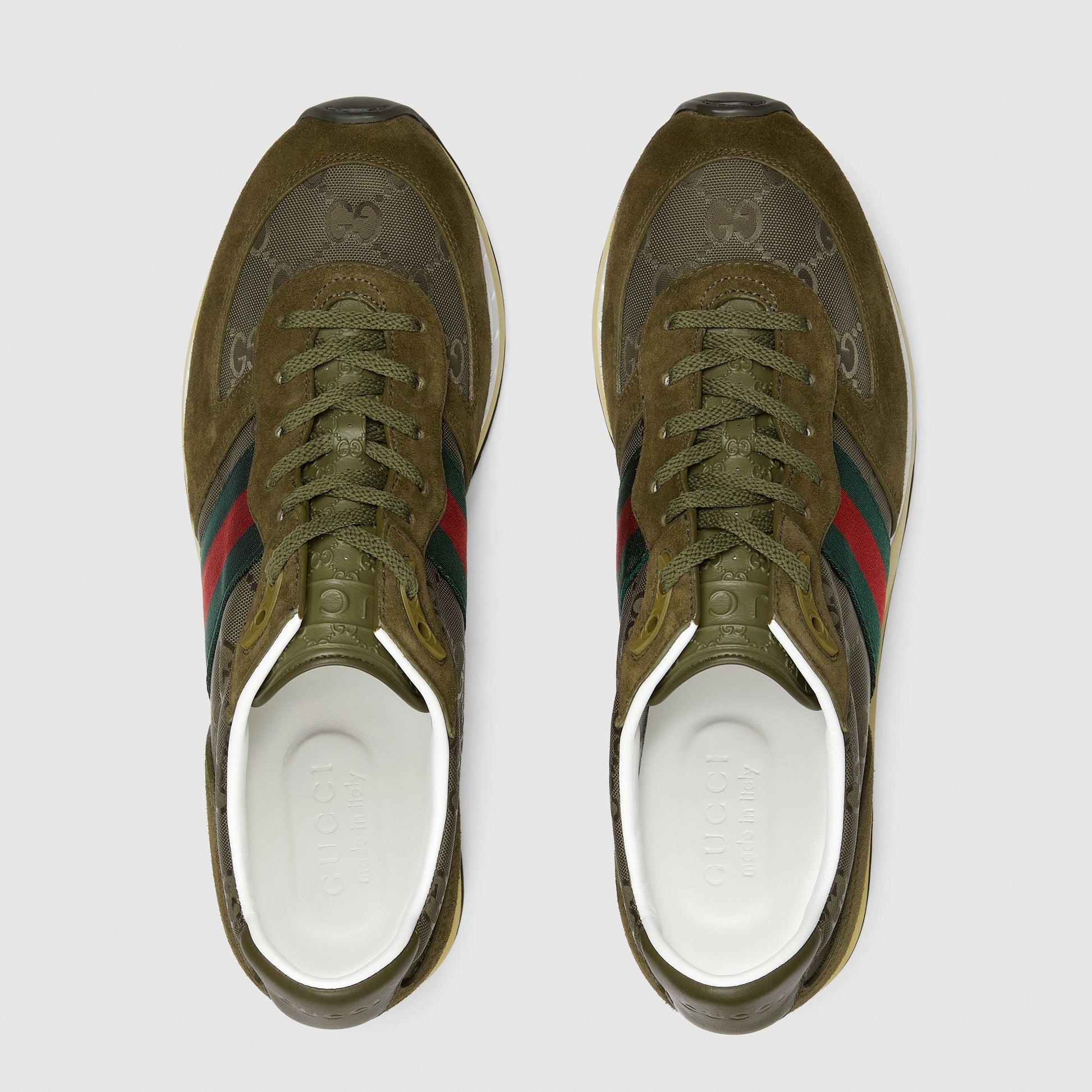 The Gucci Re-Motion Sneaker blends vintage inspiration with contemporary design. Crafted from dark green Original GG canvas, this elevated silhouette is accented with suede trim and the iconic green and red Web, creating a timeless yet modern look.