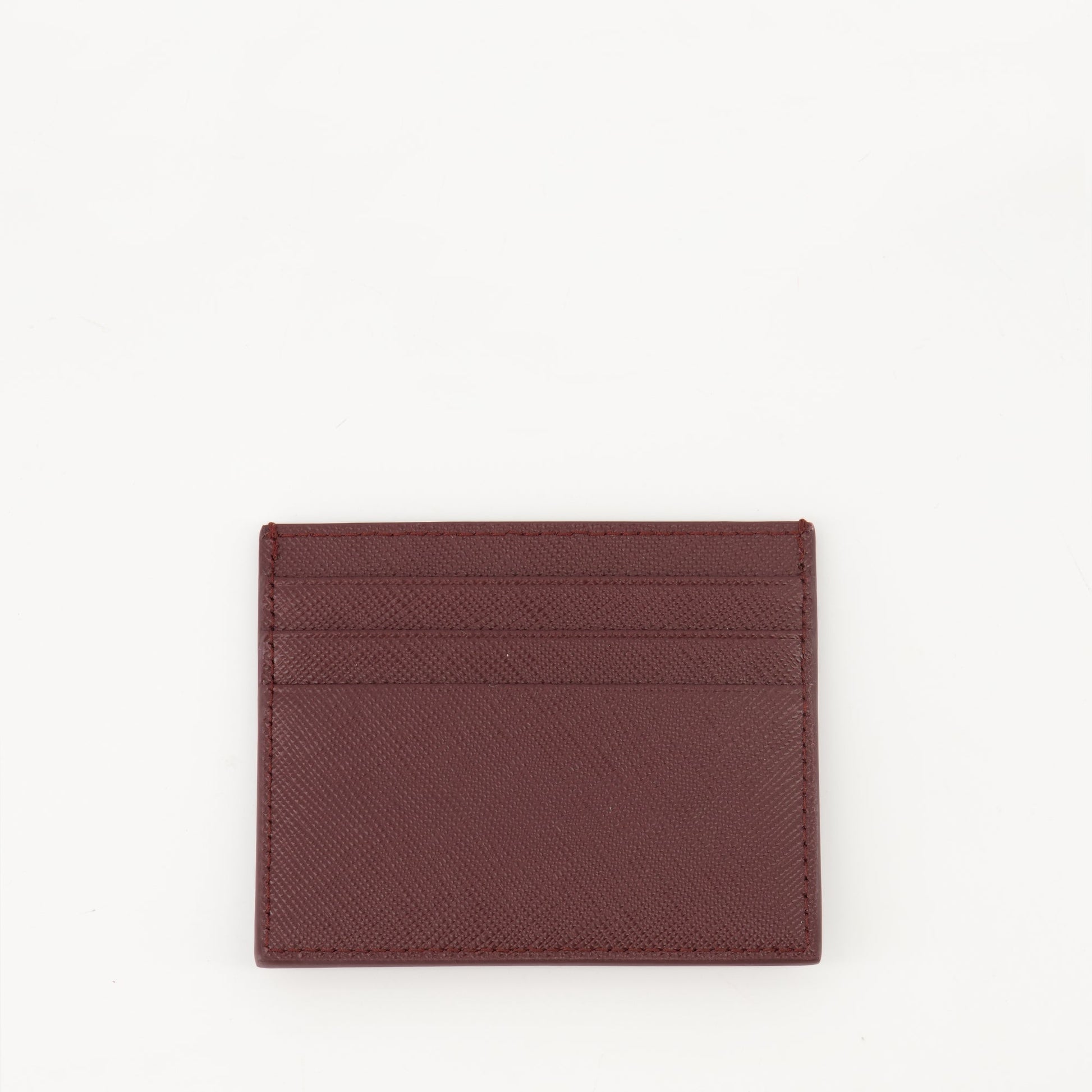 Saffiano leather card holder in Bordeaux from Prada for women, part of the Autumn-Winter 2025 collection. It features six card slots and a practical interior pocket.
