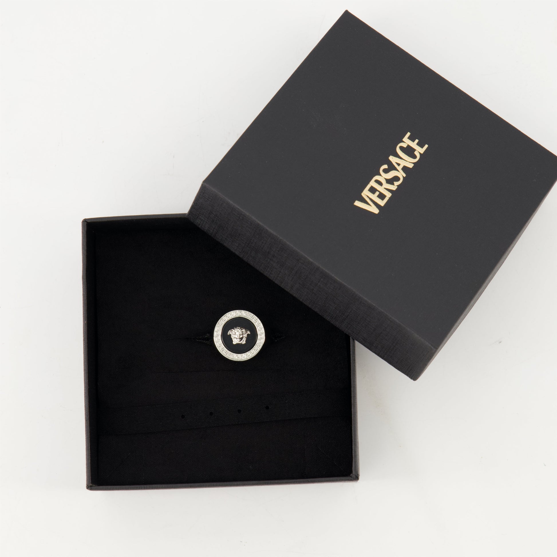 Silver Medusa ring by Versace for men, made of metal with a raised Medusa logo. This piece is part of the Spring-Summer 2025 collection, combining style and elegance.