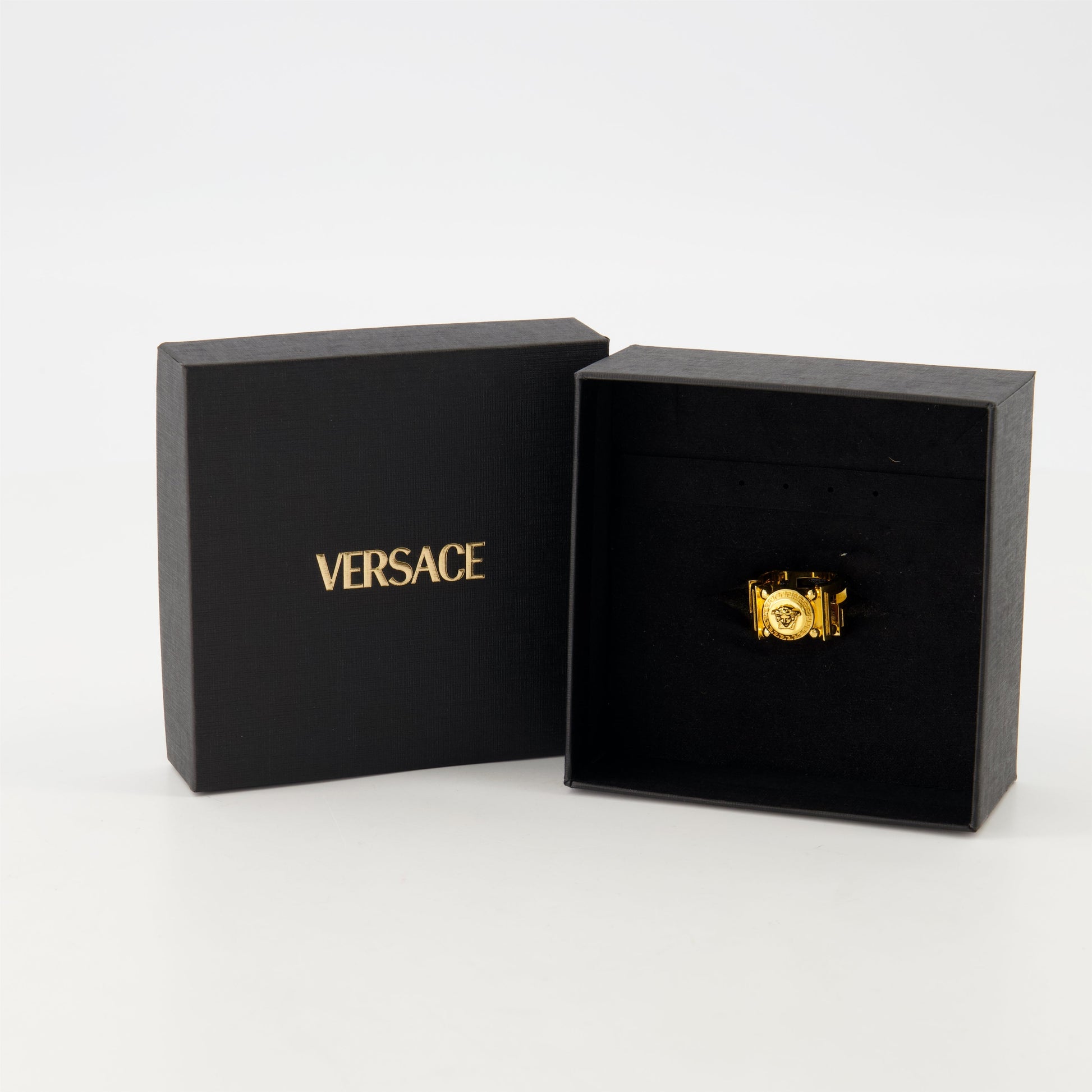 Golden Medusa Greca ring by Versace, unisex, combines elegance and modernity. This piece is part of the Spring-Summer 2025 collection, made of metal featuring a raised Medusa logo.