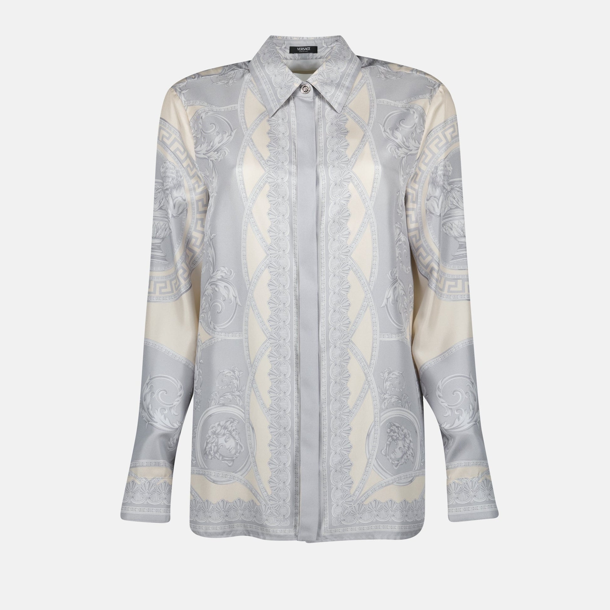 Gray silk shirt La Coupe des Dieux by Versace for women. This piece is part of the Spring-Summer 2025 collection and features refined details and a distinctive print.