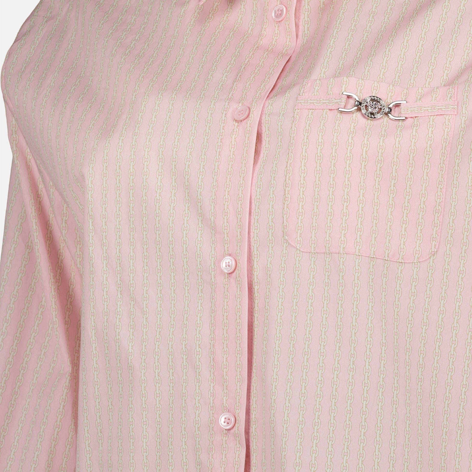Pink crop shirt by Versace for women from the Spring-Summer 2025 collection. Made from cotton, it features a classic collar, long sleeves, and a Chain print with a Medusa finish.