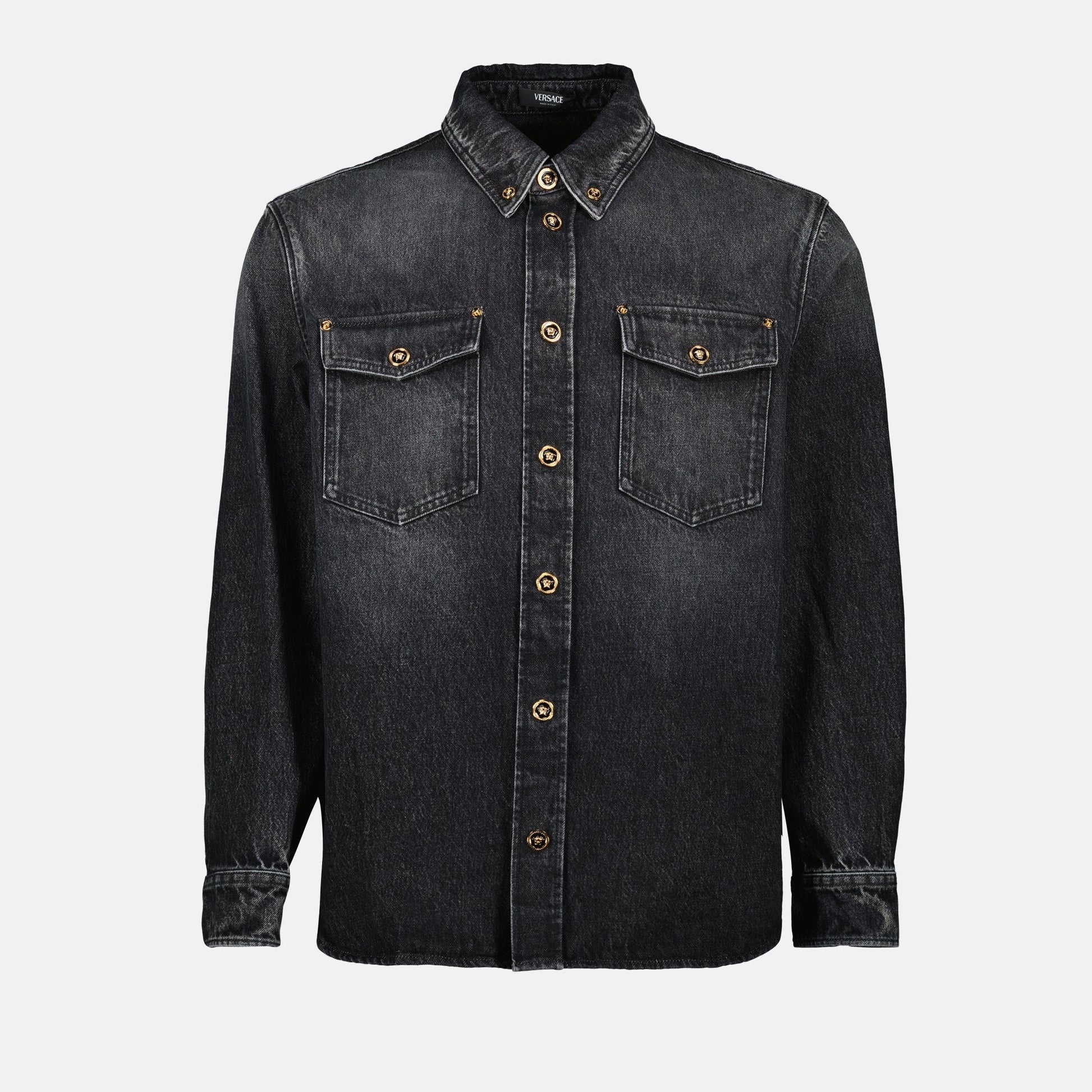 Gray washed denim shirt by Versace for men, from the Spring-Summer 2025 collection. It features a classic collar, long sleeves, and Medusa metal buttons.