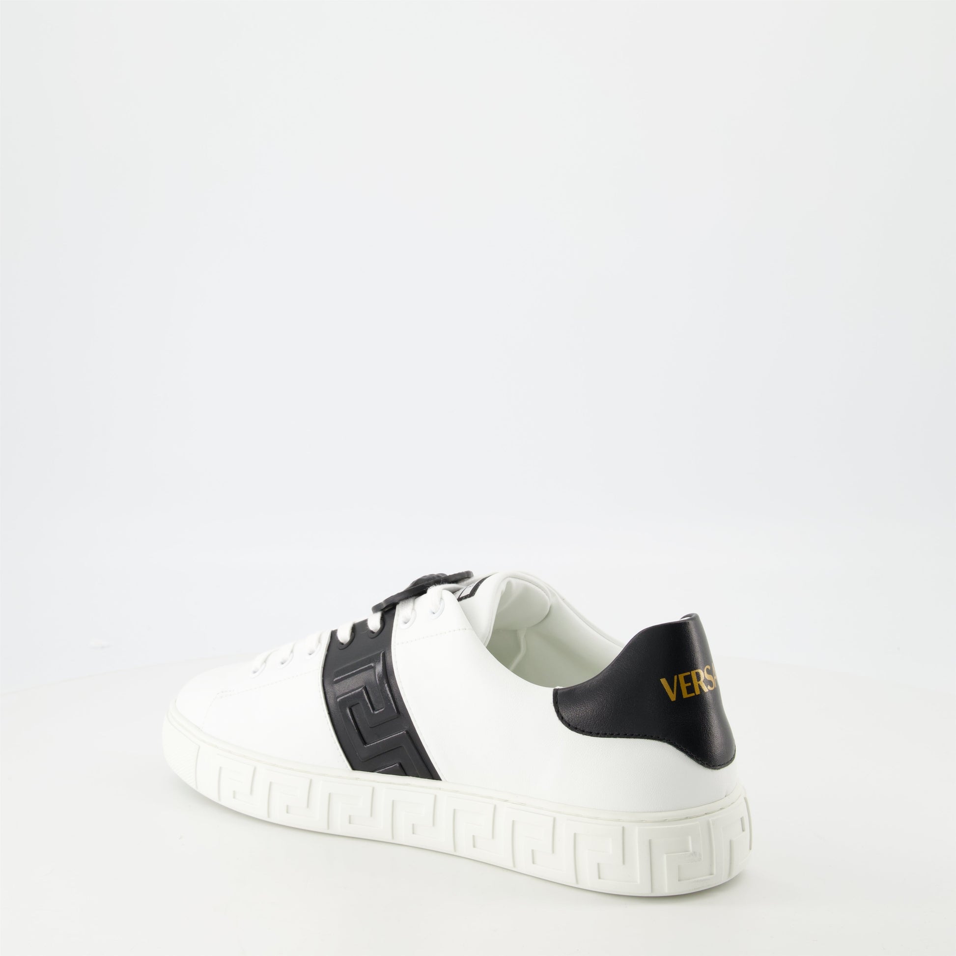 Greca sneakers in white and black leather from Versace for men, combining comfort and style. This pair is part of the Spring-Summer 2025 collection, featuring iconic details and a treaded sole.