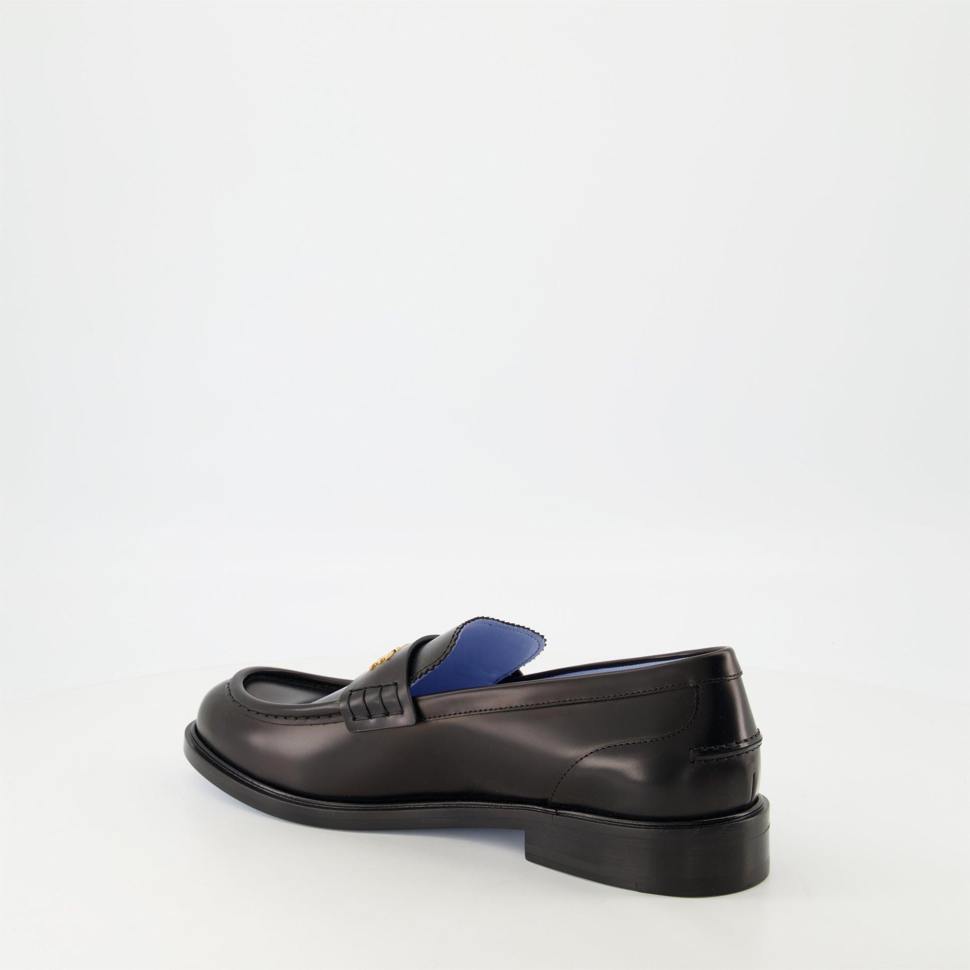 Black leather loafers by Versace for men, made from goat leather with a slip-on design and metallic finishes. This piece is part of the Spring-Summer 2025 collection.