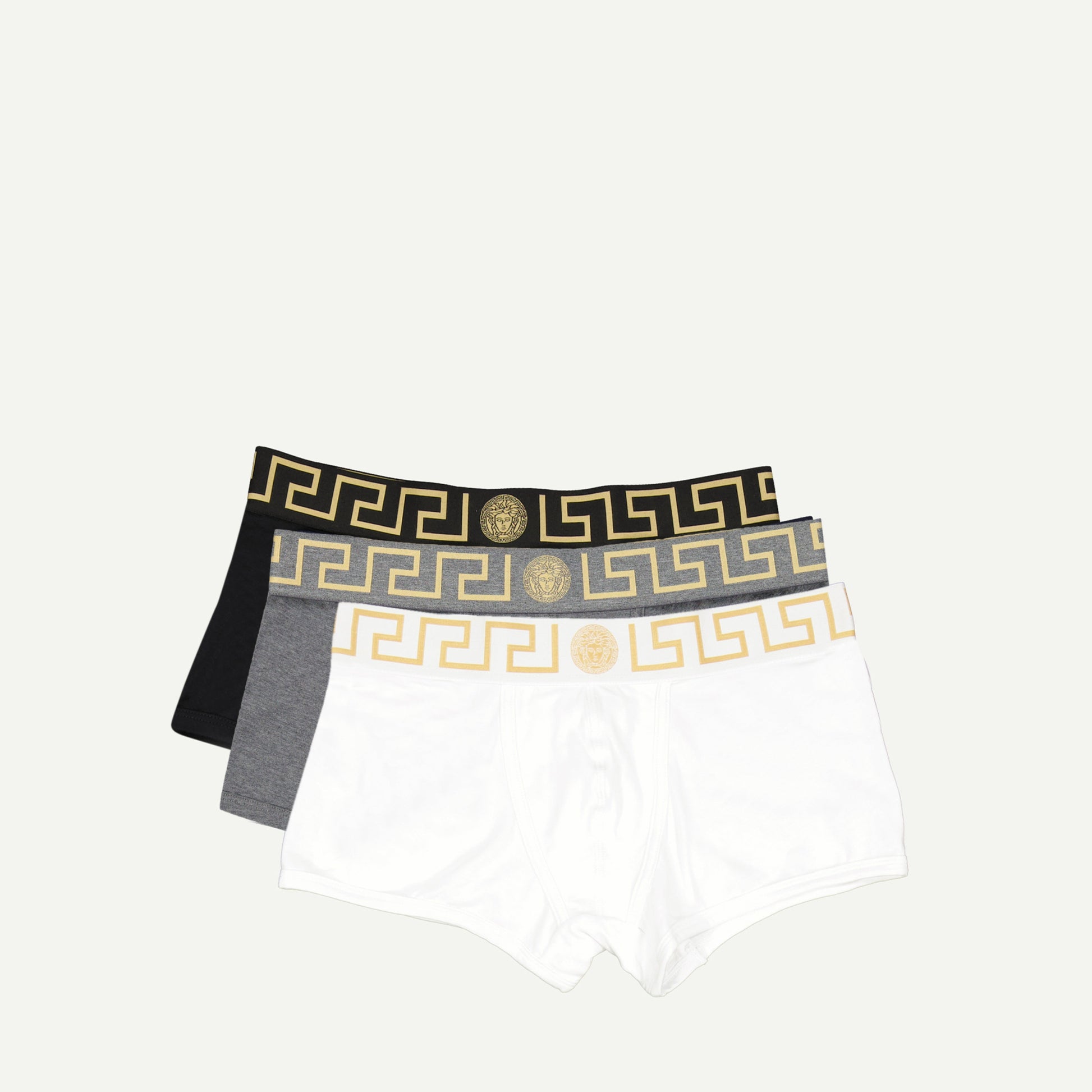 Set of three black, gray, and white boxers from the brand Versace for men. This Spring-Summer 2025 collection combines comfort with cotton-elastane and style featuring the Medusa Greca emblem.