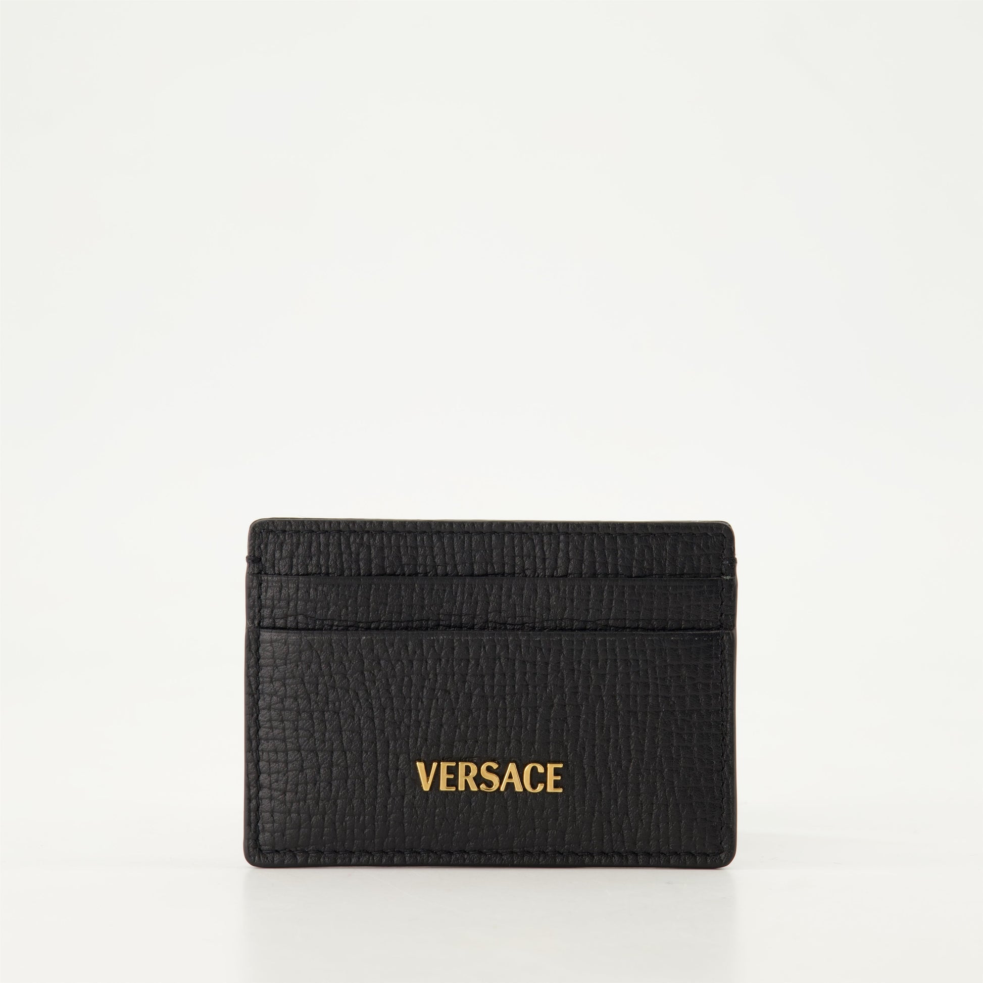 The Myth card holder in leather from Versace is an elegant accessory for men. Part of the Spring-Summer 2025 collection, it is made from black grained leather with a metallic logo.