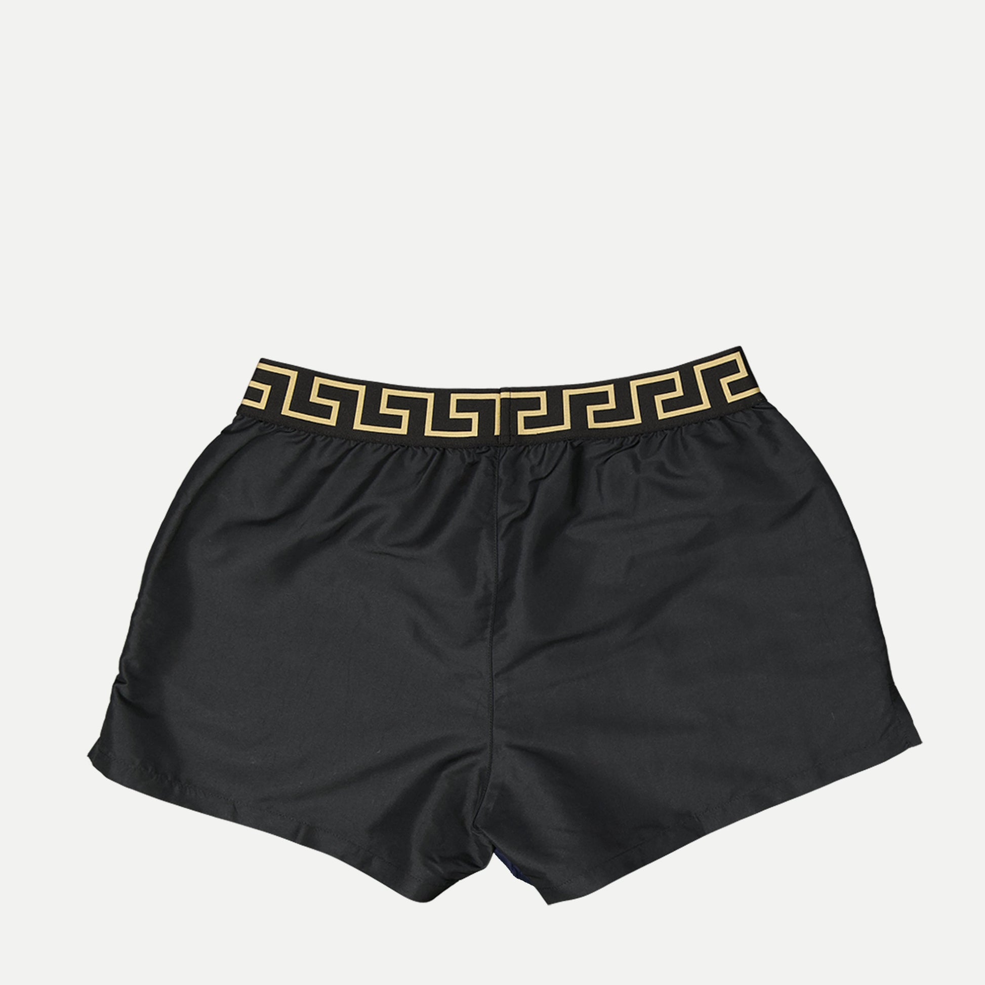 Greca black swim shorts from Versace for men, part of the Spring-Summer 2025 collection. Made from recycled polyester, it features a Medusa pattern and a distinctive Greca border.