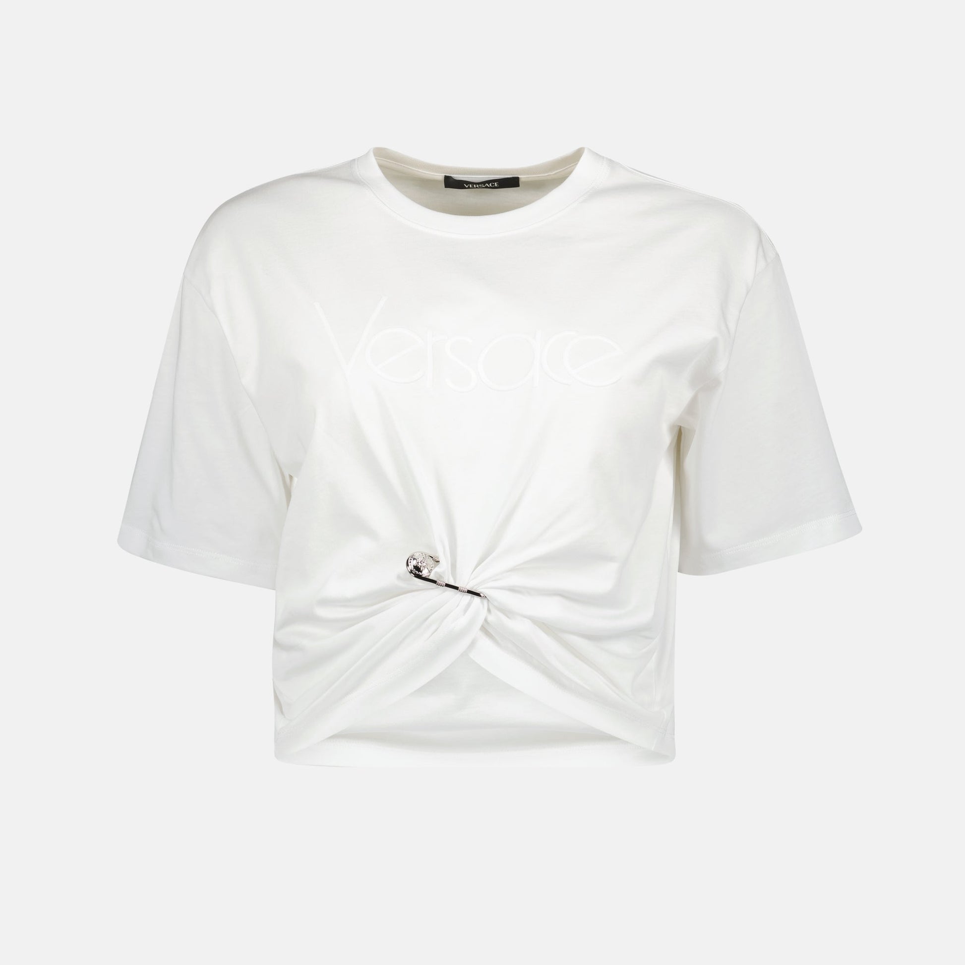 White Safety Pin T-shirt by Versace for women, designed in cotton with a cropped fit and round neckline. This piece is part of the Spring-Summer 2025 collection.