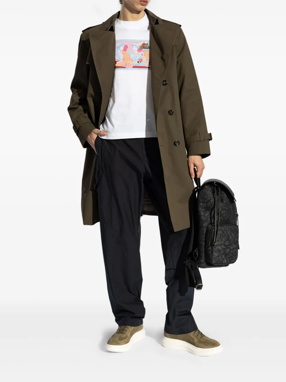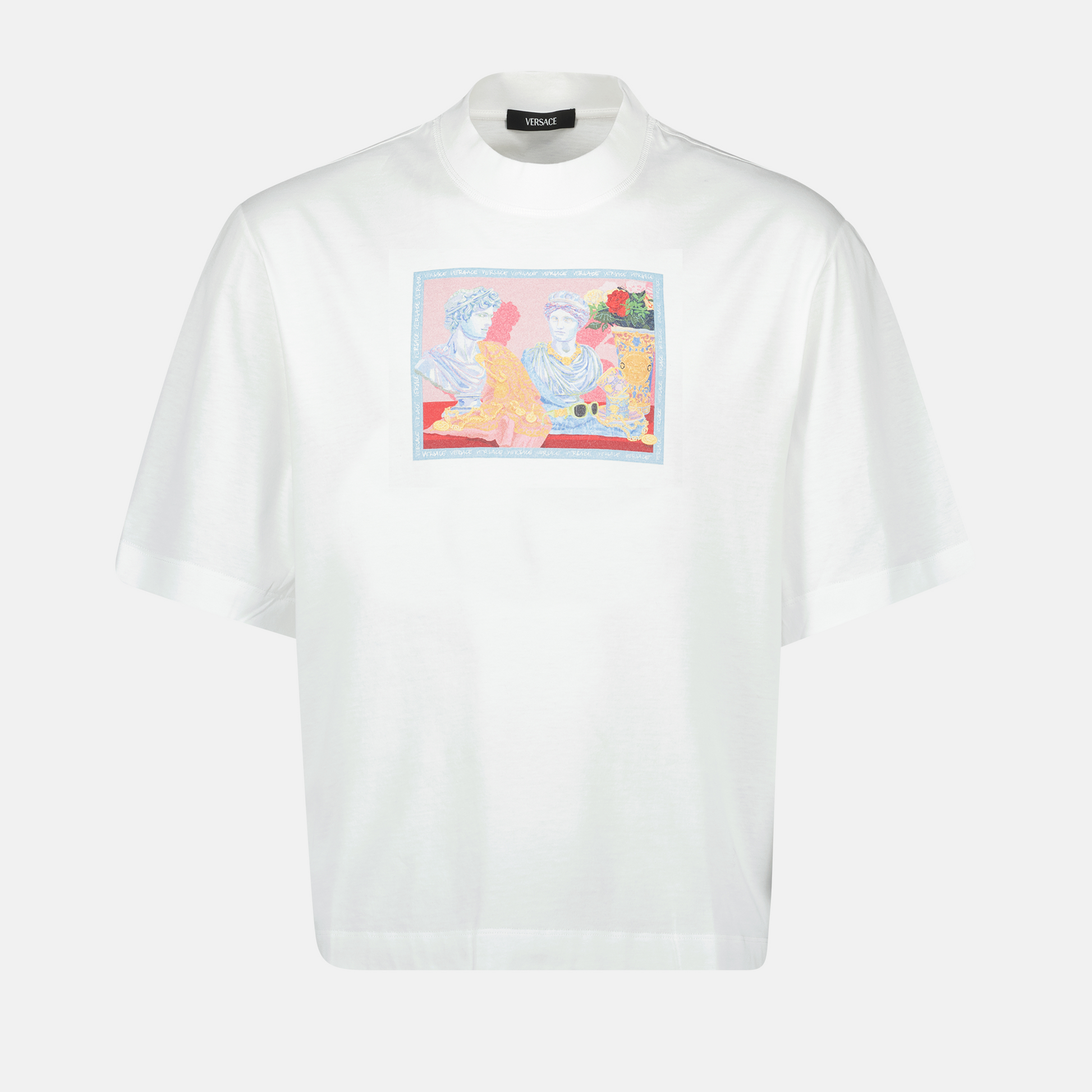 White printed T-shirt from the brand Versace, designed for men. This model is part of the Spring-Summer 2025 collection and is made of cotton with a round neck and short sleeves.