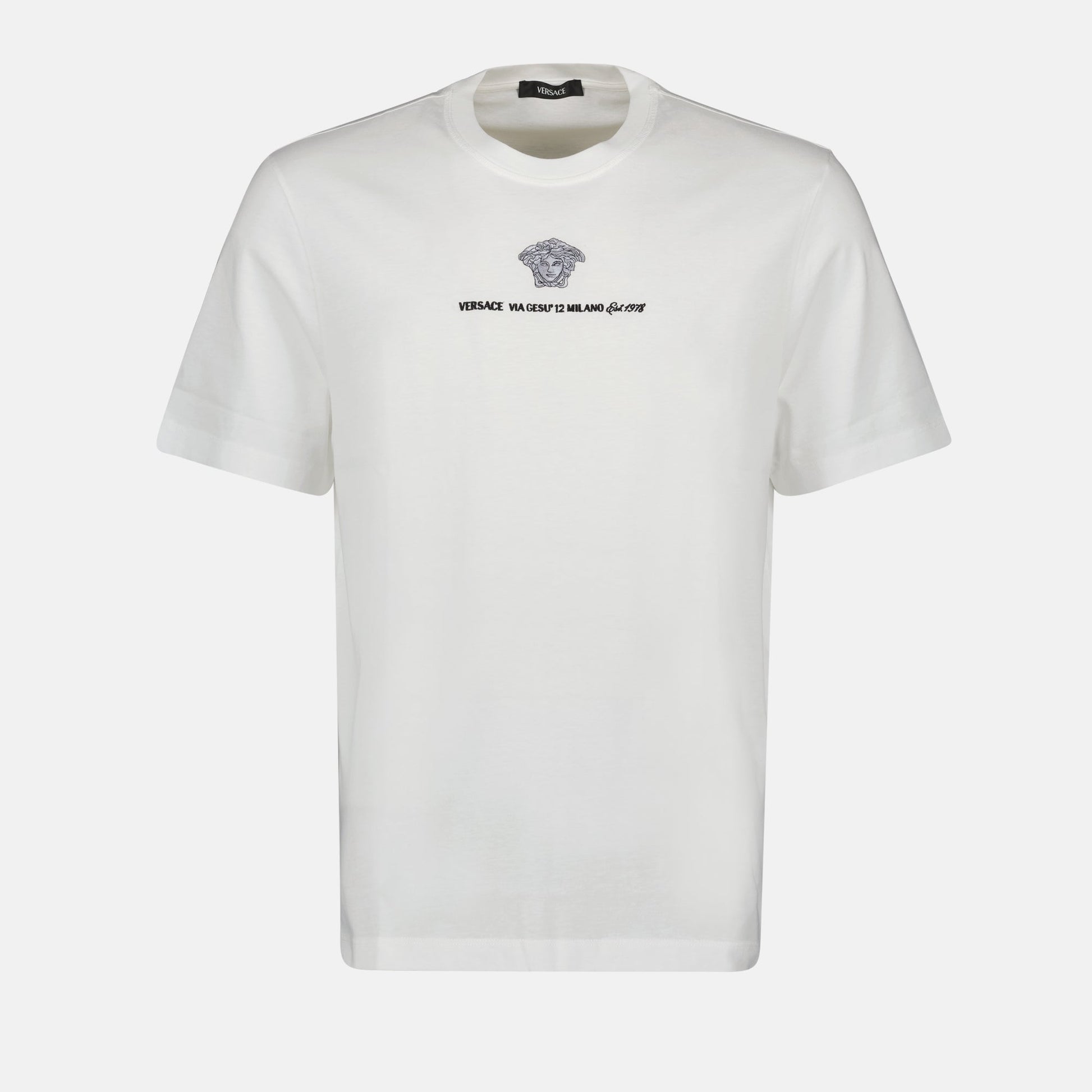 Via Gesu T-shirt from the Versace Fall-Winter 2024 collection for Men. Made from cotton. Item color: white. Round neck and short sleeves. This item is available in several variations.