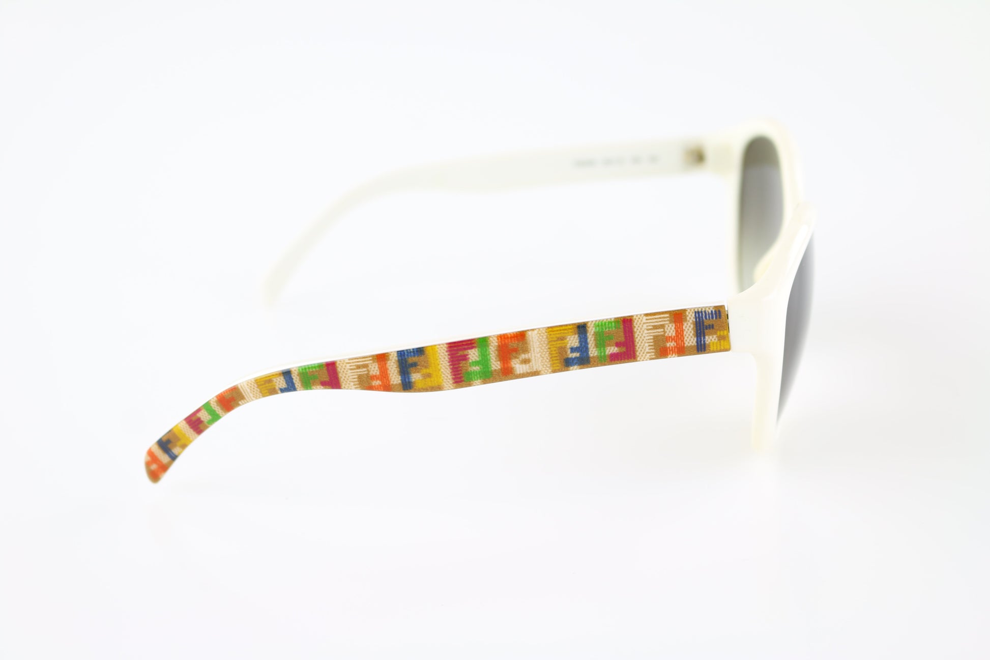 Authentic Fendi White Cat Eye Sunglasses. In excellent, preowned condition. Light marks to lenses, arms need to be adjusted/tightened. Comes with: case, cleaning cloth. Made in Italy. Please see photos with zoom for detail.