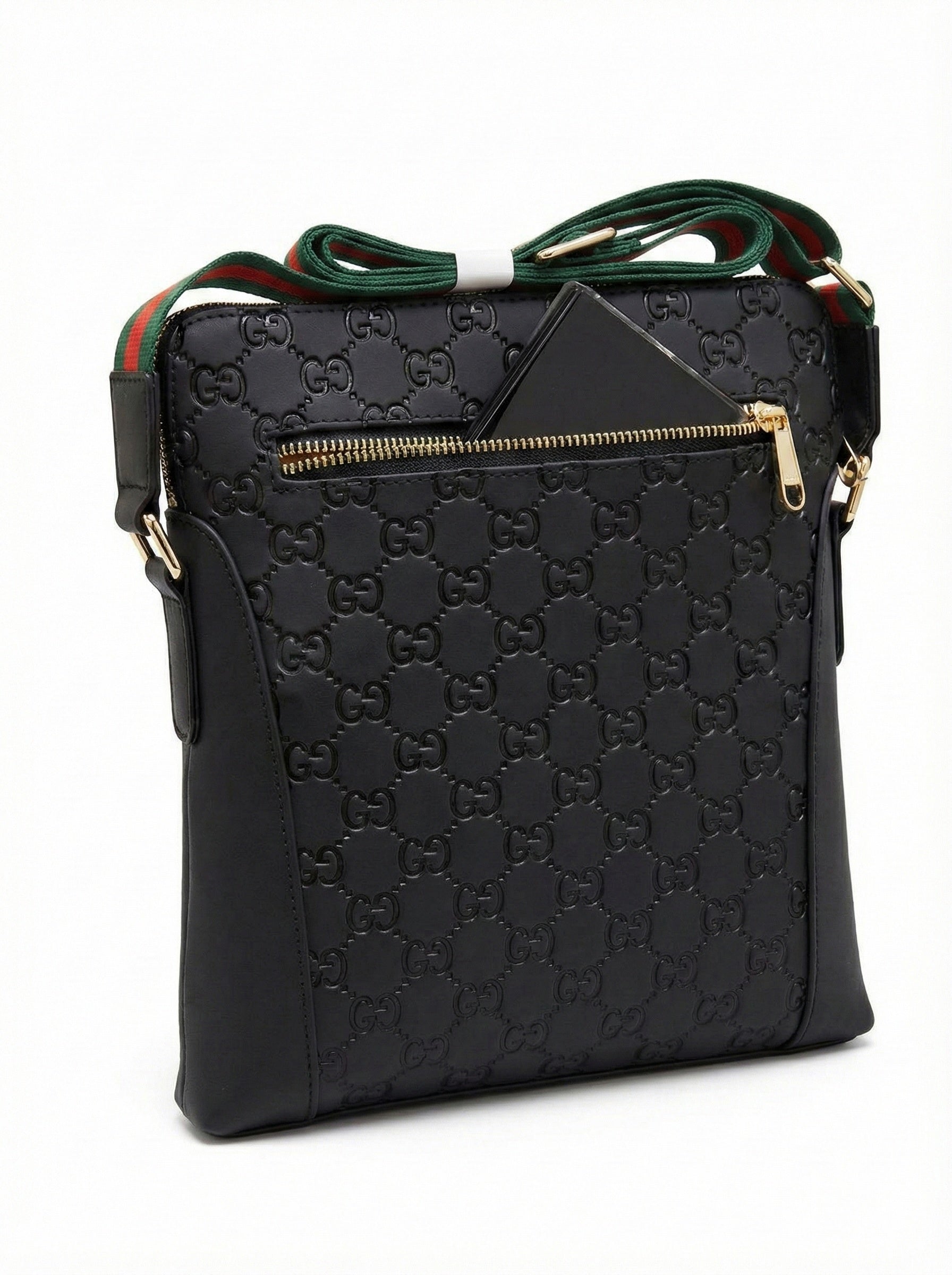 This messenger bag from Gucci is a refined expression of the House’s signature codes, combining heritage detailing with modern functionality. Crafted from smooth black leather, the silhouette is defined by an all-over GG embossed pattern, lending subtle texture and a distinctive branded finish.